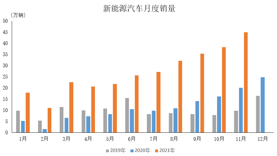 2021年11月,新能源汽车市场表现依然出色,产销量再创历史新高,分别达到45.7万辆和45.0万辆,环比增长15.1%和17.3%,同比增长1.3倍和1.2倍。