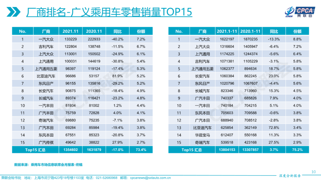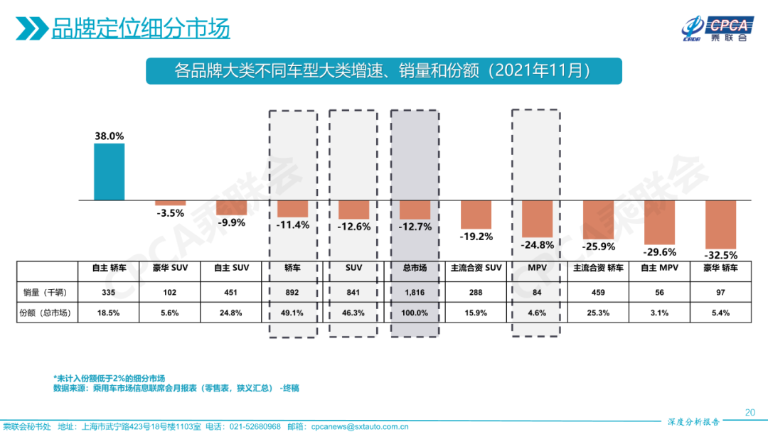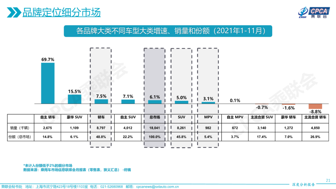 - 各品牌大类下不同车型大类增速、销量和份额——2021年11月及累计