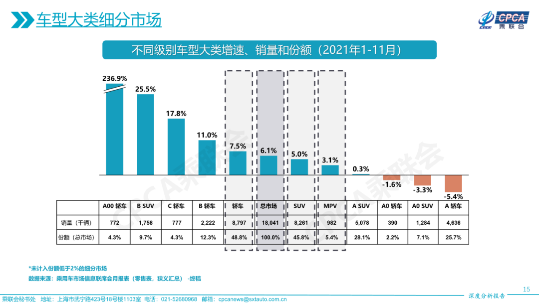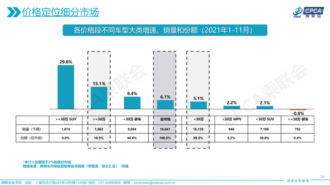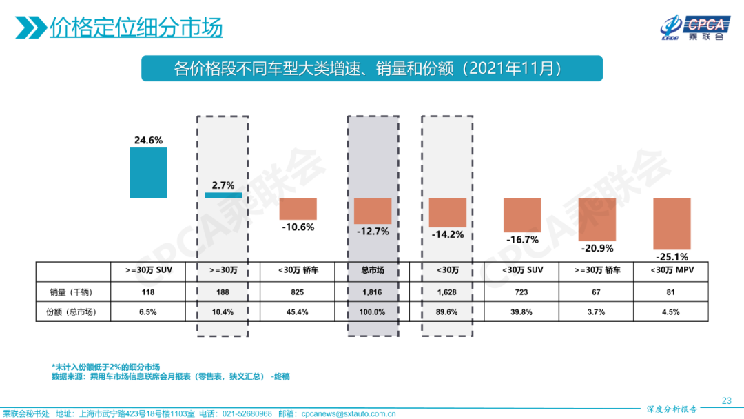 - 各价格段不同车型大类增速、销量和份额——2021年11月及累计