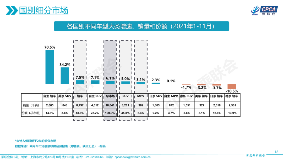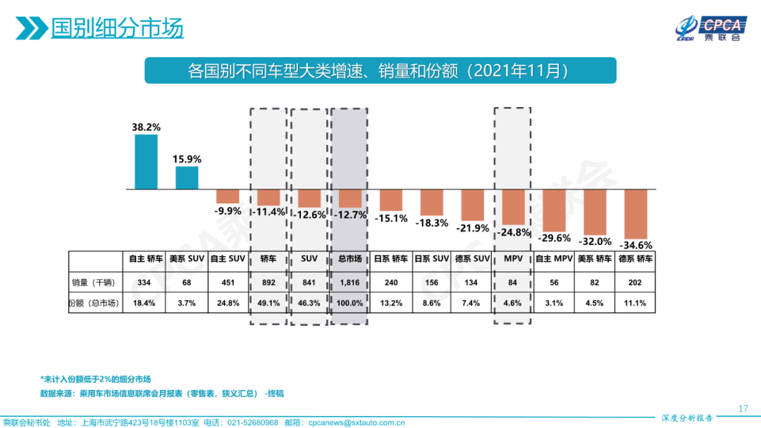 - 各国别不同车型大类增速、销量和份额——2021年11月及累计
