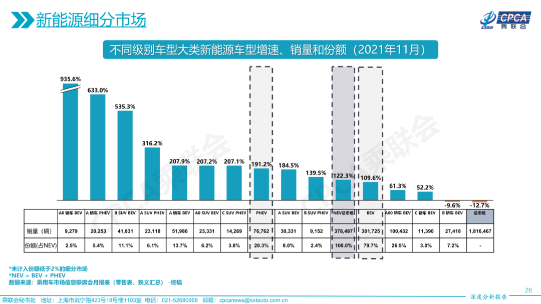 - 不同级别车型大类新能源车型增速、销量和份额——2021年11月及累计