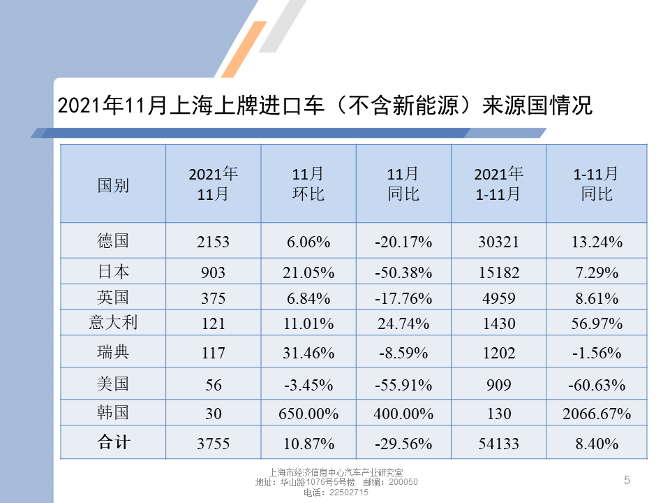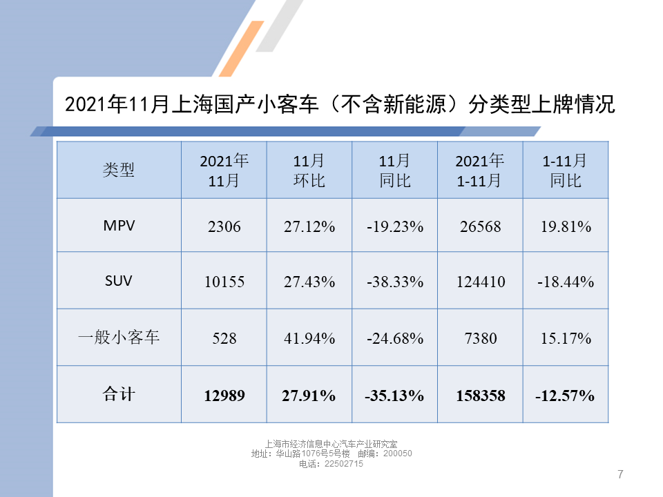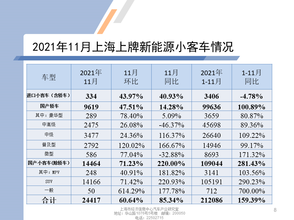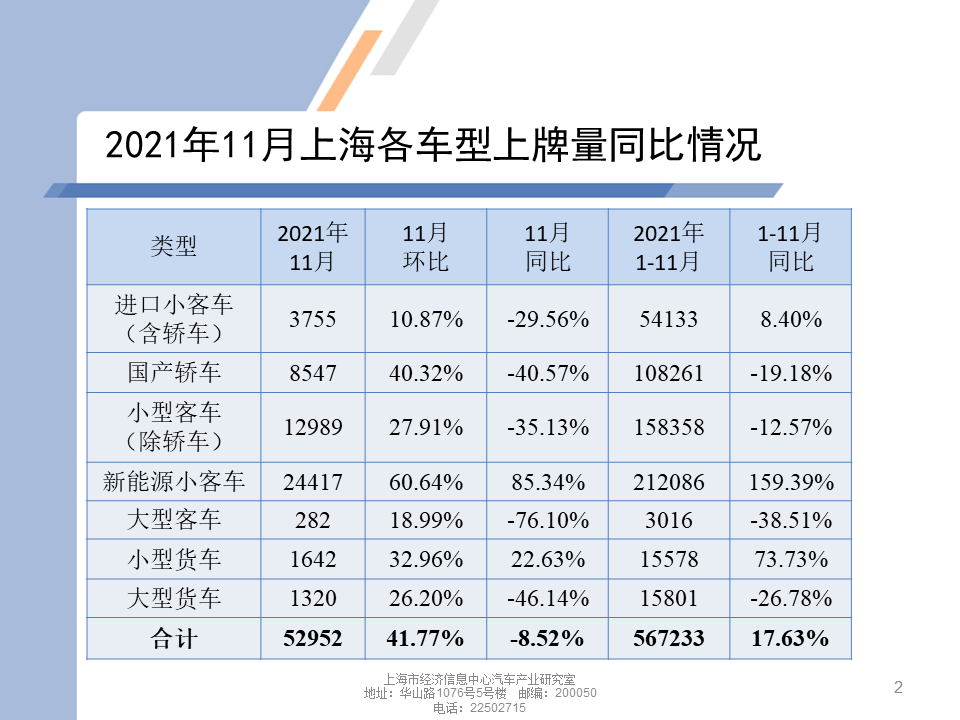 乘联会:2021年11月上海汽车市场上牌情况 2021年11月上海总体上牌数是52,952。环比增长41.77%,同比下降8.52%。 1-11月累计上牌数567,233,累计同比增长17.63%。 11月具体分类型的上牌情况是:进口小客车(含轿车)3,755;国产轿车8,547;小型客车(除轿车)12,989;新能源小客车24,417;大型客车282;小型、大型货车分别是1,642和1,320。 更多阅读:上海经济信息中心:2021年10月上海汽车市场上牌情况乘联会:2021年5月上海汽车市场上牌情况乘联会:2021年7月上海汽车市场上牌情况中国汽车流通协会:2021年10月上海汽车市场上牌情况中国汽车流通协会:2020年8月上海汽车市场上牌情况中国汽车流通协会:2020年7月上海汽车市场上牌情况上海经济信息中心:2022年7月上海汽车市场上牌情况上海经济信息中心:2022年8月上海汽车市场上牌情况上海经济信息中心:2022年3月上海汽车市场上牌情况上海经济信息中心:2021年12月上海汽车市场上牌情况上海经济信息中心:2023年2月上海汽车市场上牌情况上海经济信息中心:2022年6月上海汽车市场上牌情况上海经济信息中心:2024年4月上海汽车市场上牌情况中国汽车流通协会:2019年8月上海汽车市场上牌情况上海信息中心:2019年3月上海汽车市场上牌情况