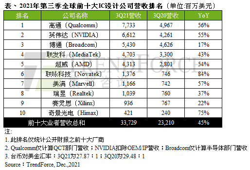 根据TrendForce集邦咨询表示,2021年第三季半导体市场热络,全球前十大IC设计业者总计营收达337亿美元,年增45%。其中,除了联发科(MediaTek)、联咏(Novatek)、瑞昱(Realtek)原本就列居排行榜中,此次奇景(Himax)也抢进第十名。