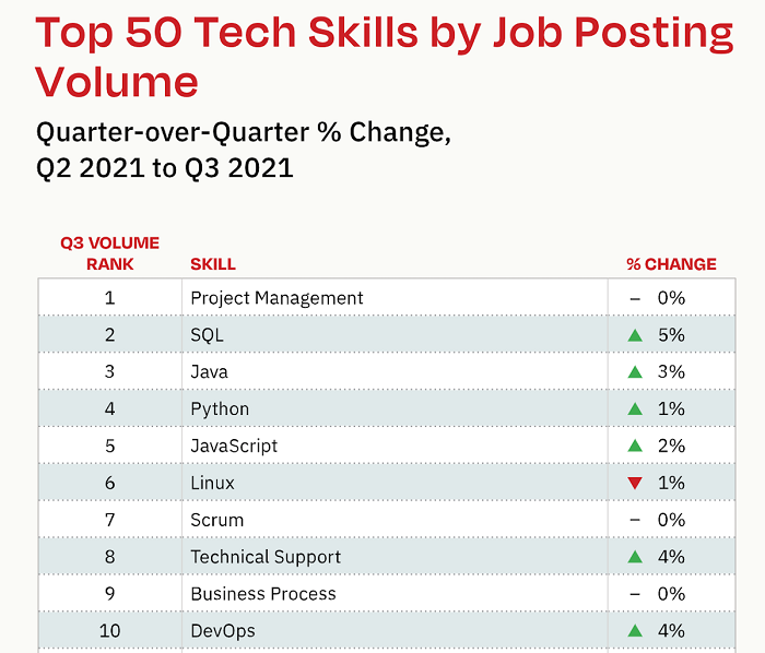 而 3 季度的招聘信息显示,在全美范围内,除了 SQL、Java、Python、Linux 等技能,企业还正在寻找覆盖更多领域、深入了解软件开发 / 项目管理等核心概念的技术人才。