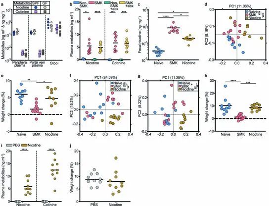 为了证实肠道微生物确实是 “戒烟” 小鼠体重增加的主要调节因素,这些作者在不同的时间点收集了 “吸烟” 或 “戒烟”小鼠的肠道微生物组,并将它们的肠道微生物组转移到从未暴露于香烟中的无菌小鼠体内。受体小鼠出现了与在 “吸烟” 小鼠中观察到的类似的肠道微生物失衡,并逐渐增加体重,这一现象在移植了在戒烟期间收集的肠道微生物组的受体小鼠中最为明显。在移植前,当作为供体的 “吸烟” 小鼠接受抗生素治疗时,这种体重增加明显减少。