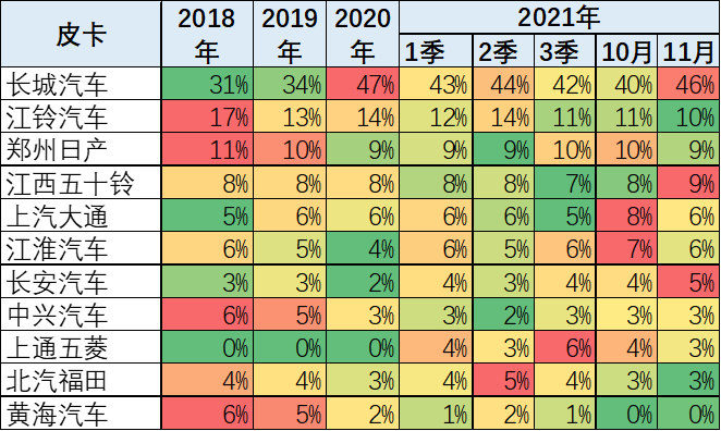 皮卡市场份额10%左右的厂商目前有江铃汽车、郑州日产以及江西五十铃也是很强的,这几家都是历史上相对强势的传统厂商。