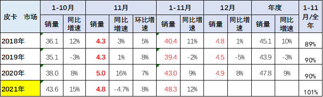 2021年皮卡批发市场走势相对较强,原因是2020年起步较低,由于2020年的年初市场异常低迷,因此不可避免。2021年11月相对于2018年和2019年同期表现相对平稳,这也是恢复常态的体现。