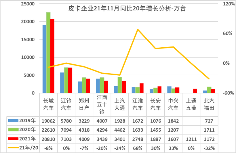 龙头车企长城皮卡受到芯片短缺而增速放缓,江铃汽车、上汽大通、江淮汽车表现很好,上汽通用五菱等新进入车企强势低价布局并占据二线主力销量地位,部分传统皮卡企业面临巨大的增长压力。
