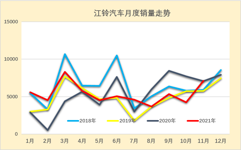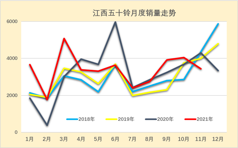 江西五十铃2021年11月厂商销量3439辆,同比下降19.9%,表现不强。