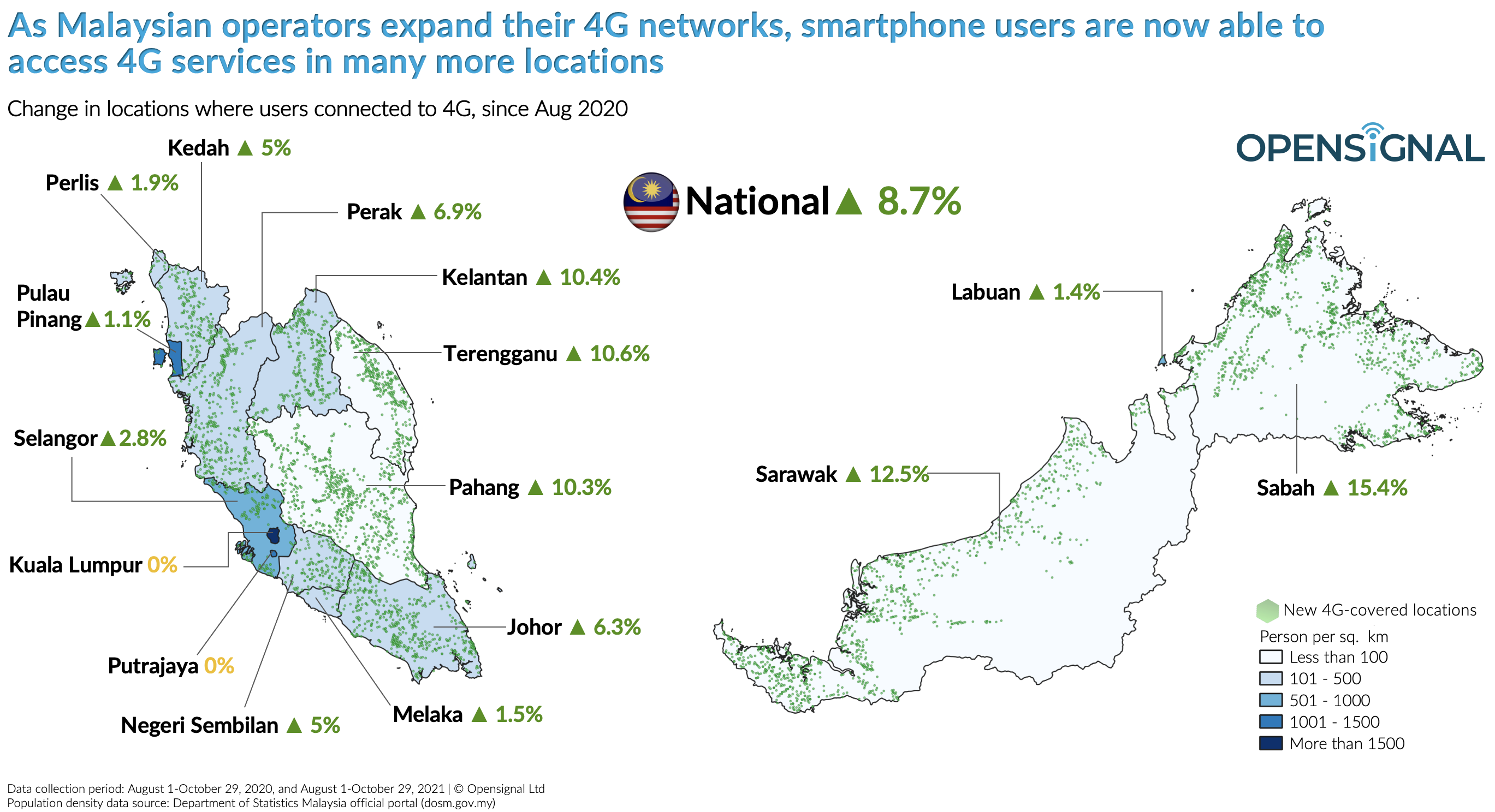 从2021年8月1日开始的90天数据和2020年的同期数据比较,马来西亚智能手机用户平均4G可用性增长了2.8个百分点,全国3G可用性下降了3.6个百分点。现在,所有地区的4G可用性都超过了80%。