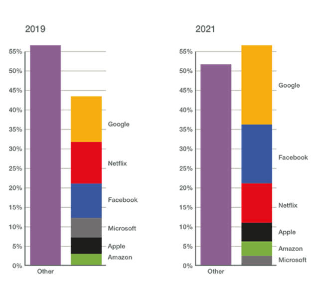 网络监控公司Sandvine首席战略官Samir Marwaha在一篇最新的博客文章中写到,该公司即将发布的2022年“全球互联网现象报告”发现,2021年,全球Top 6互联网和科技公司——Google、Facebook、Netflix、亚马逊、微软和苹果产生了超过56%的全球网络流量,他们在2021年产生的流量占比超过了所有其他互联网公司的总和。