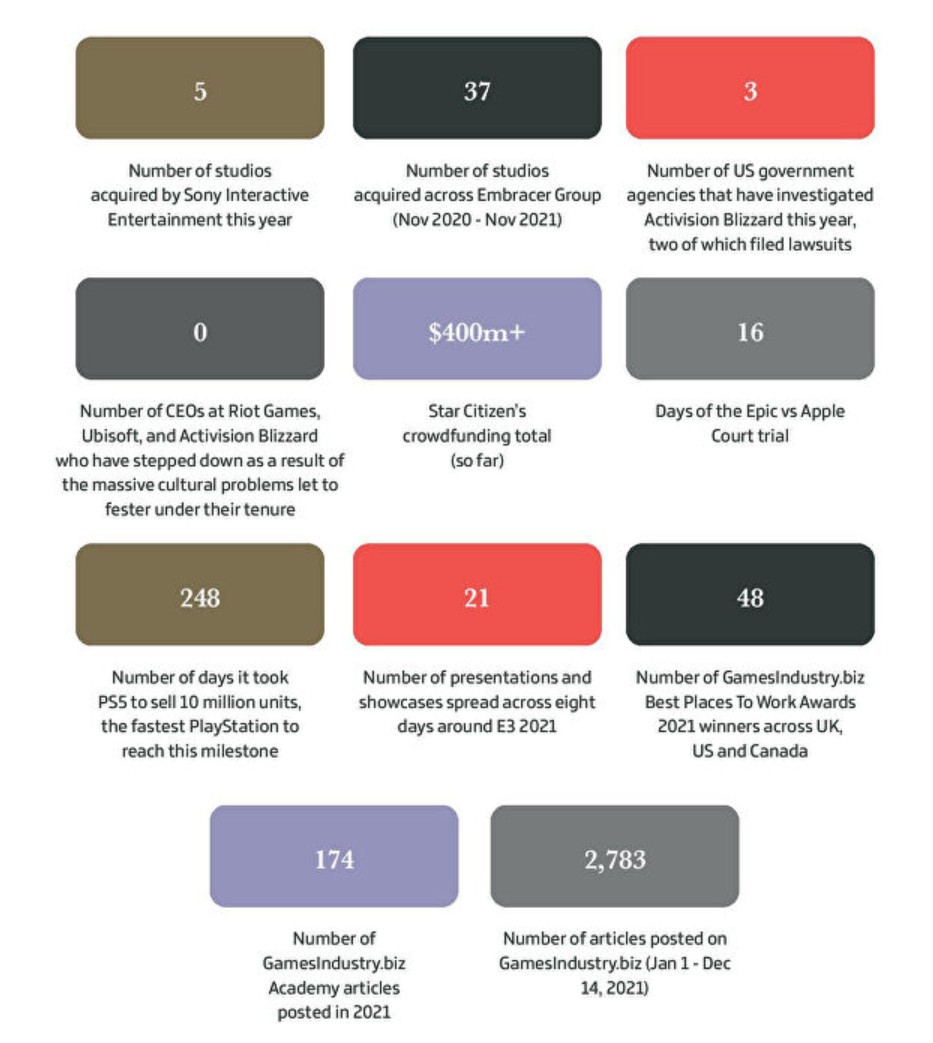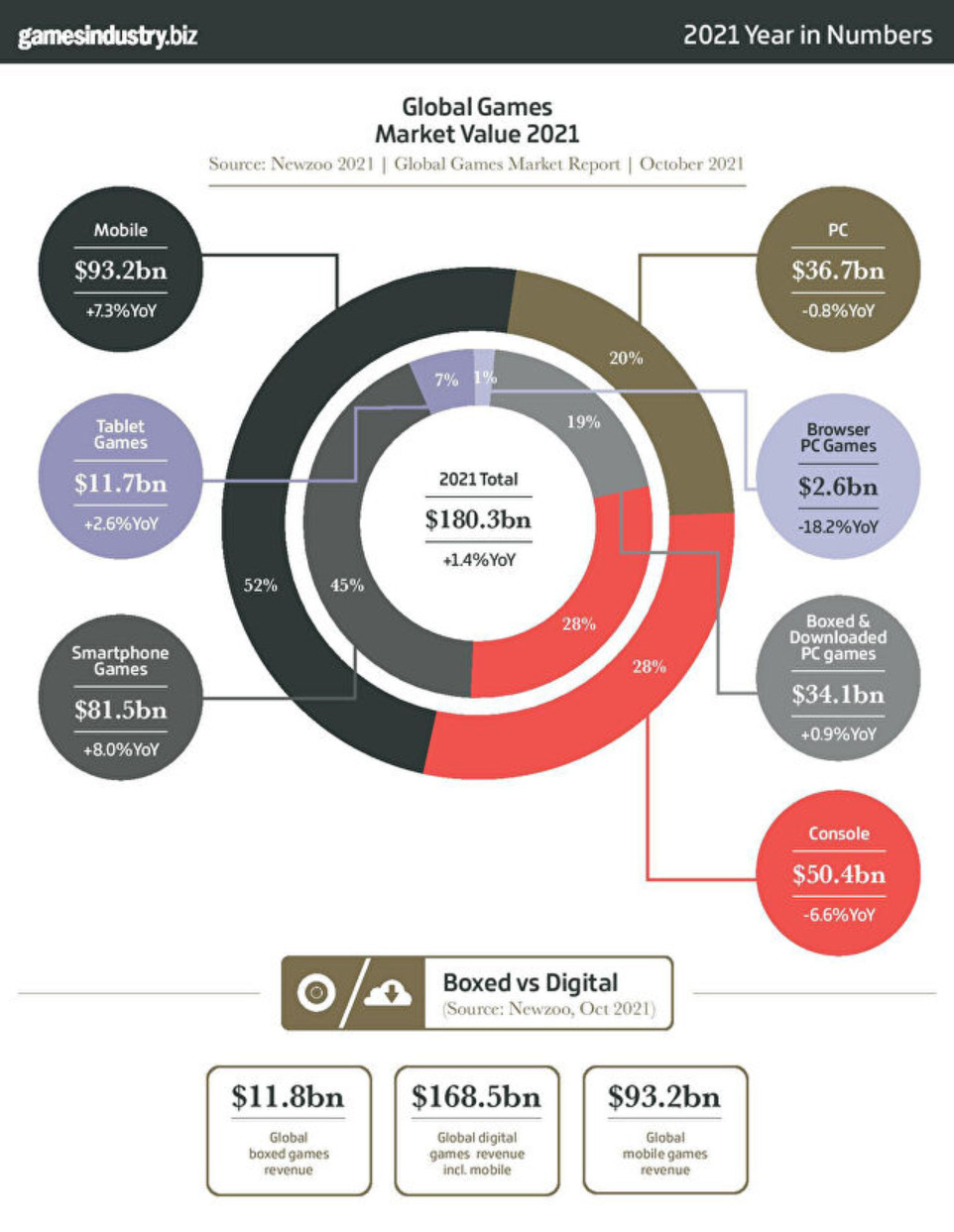 2021年马上就要结束了,外媒GamesIndustry.biz整理总结了2021年游戏行业的一些数据,包括全球游戏市值,关键领域的畅销游戏,手游最大赢家,6大发行商和三大厂商新老IP的平衡等等。2021全球游戏市场总值:1803亿美元,比去年增长了1.4%