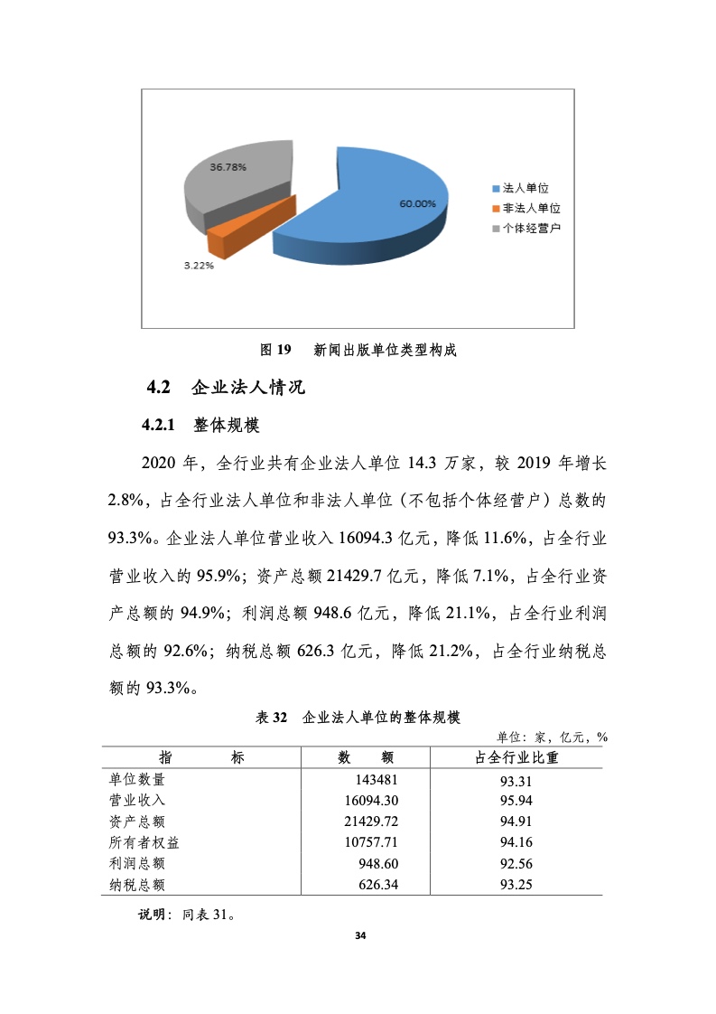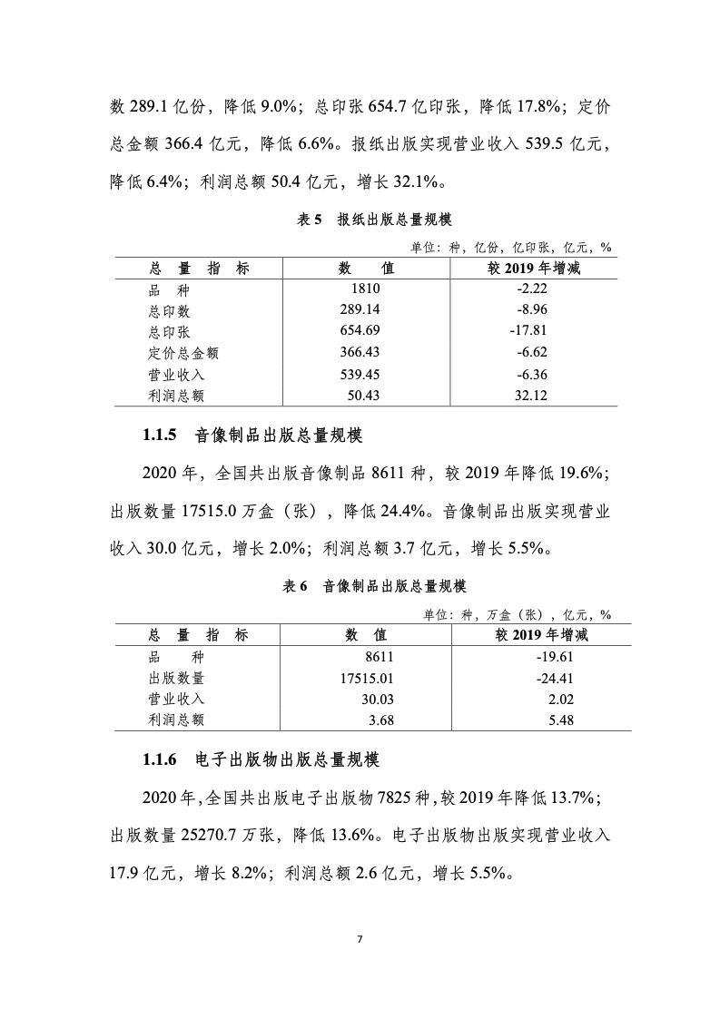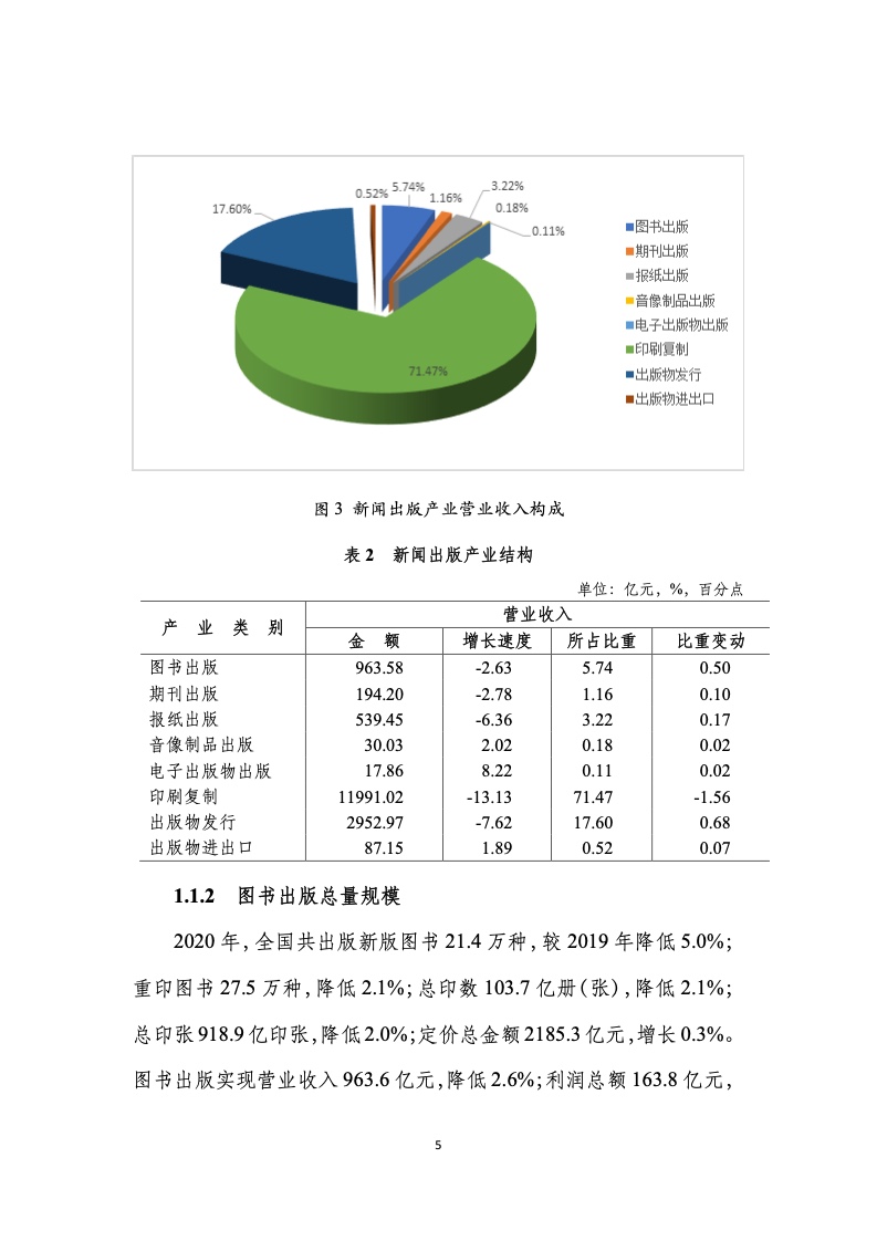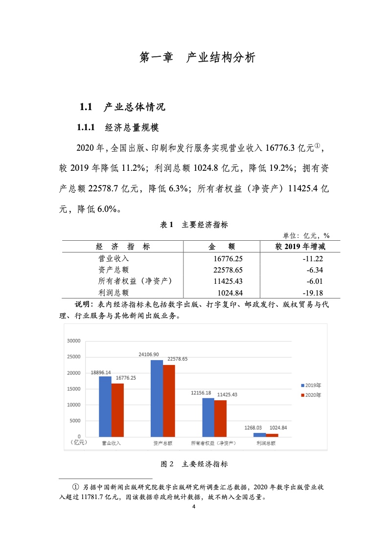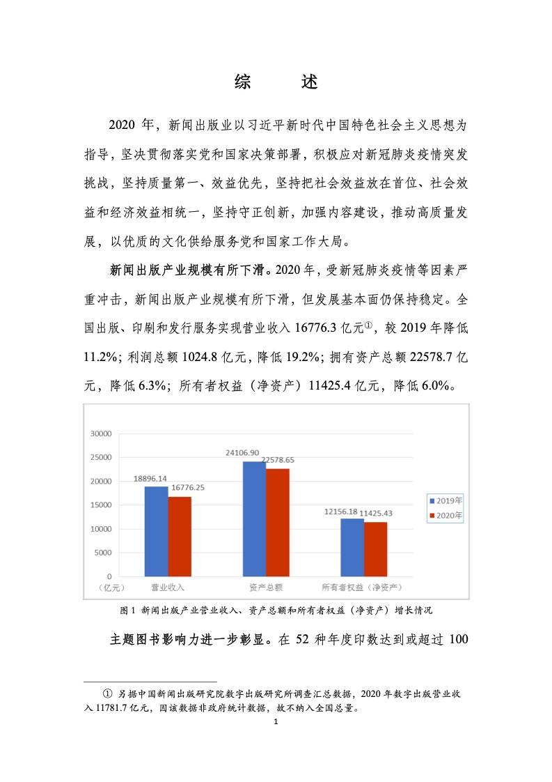 2020年受新冠肺炎疫情等因素严重冲击,新闻出版产业规模有所下滑,但发展基本面仍保持稳定。全国出版、印刷和发行服务实现营业收入16776.3亿元,较2019年降低11.2%;利润总额1024.8亿元,降低19.2%;拥有资产总额22578.7亿元,降低6.3%;所有者权益(净资产)11425.4亿元,降低6.0%。