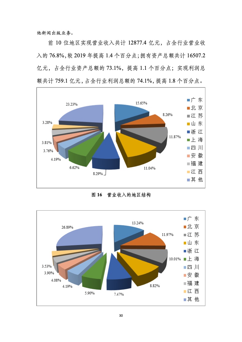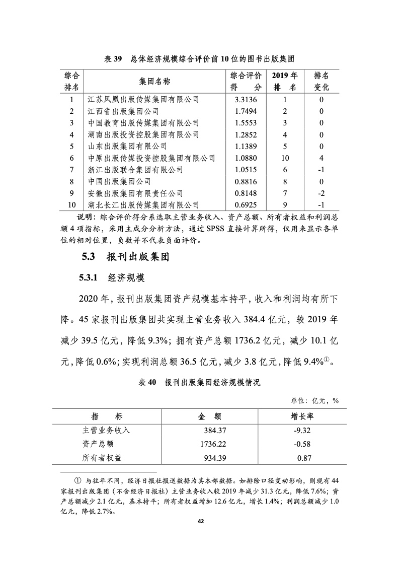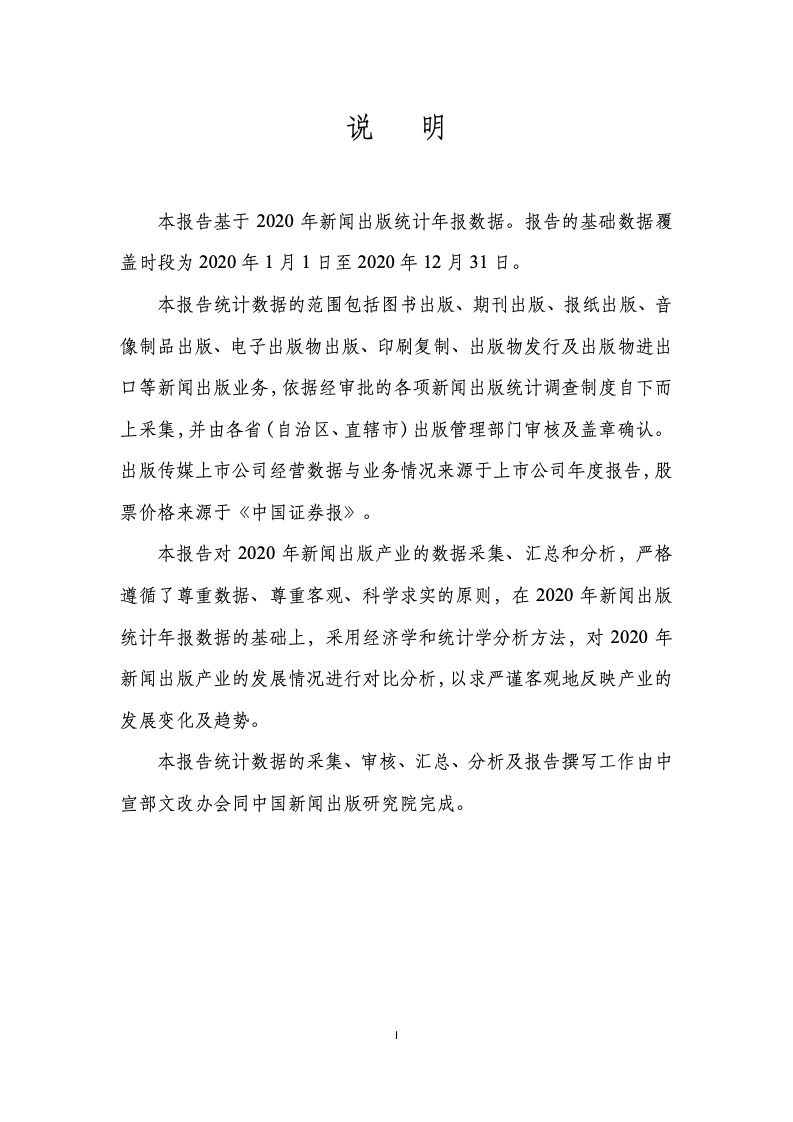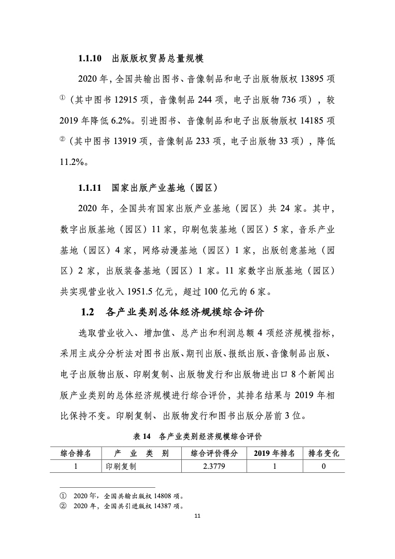 2020年受新冠肺炎疫情等因素严重冲击,新闻出版产业规模有所下滑,但发展基本面仍保持稳定。全国出版、印刷和发行服务实现营业收入16776.3亿元,较2019年降低11.2%;利润总额1024.8亿元,降低19.2%;拥有资产总额22578.7亿元,降低6.3%;所有者权益(净资产)11425.4亿元,降低6.0%。