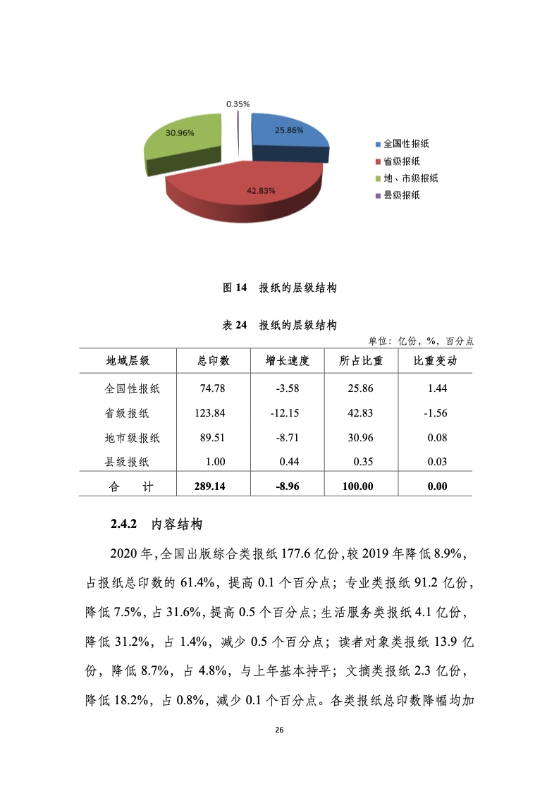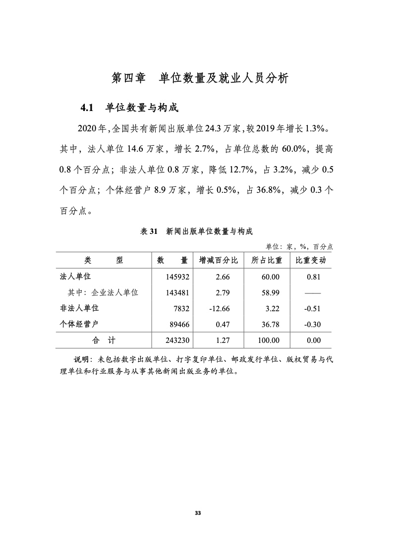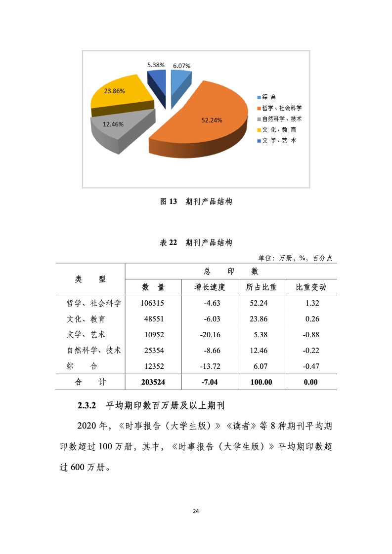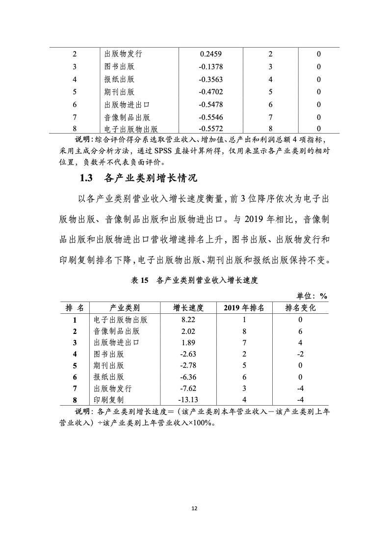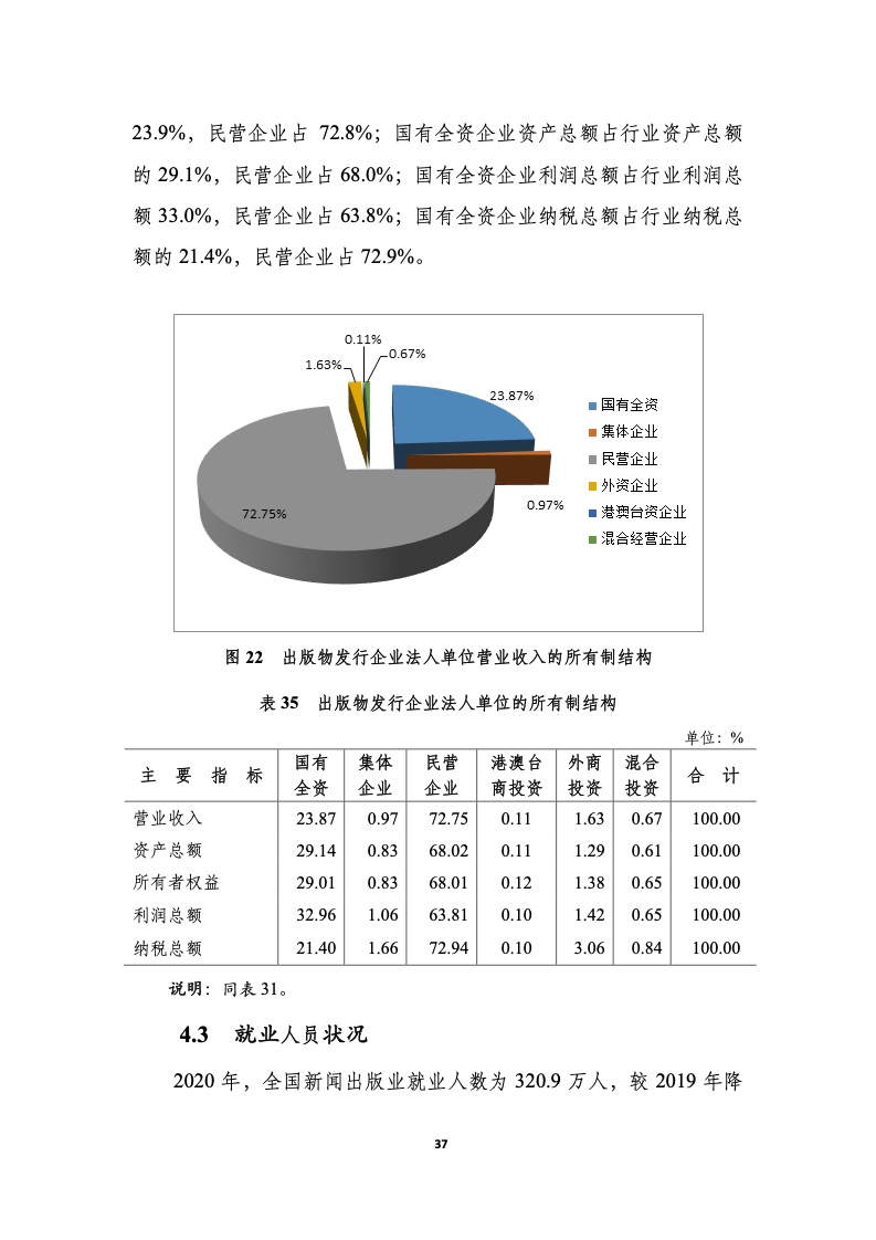 2020年受新冠肺炎疫情等因素严重冲击,新闻出版产业规模有所下滑,但发展基本面仍保持稳定。全国出版、印刷和发行服务实现营业收入16776.3亿元,较2019年降低11.2%;利润总额1024.8亿元,降低19.2%;拥有资产总额22578.7亿元,降低6.3%;所有者权益(净资产)11425.4亿元,降低6.0%。