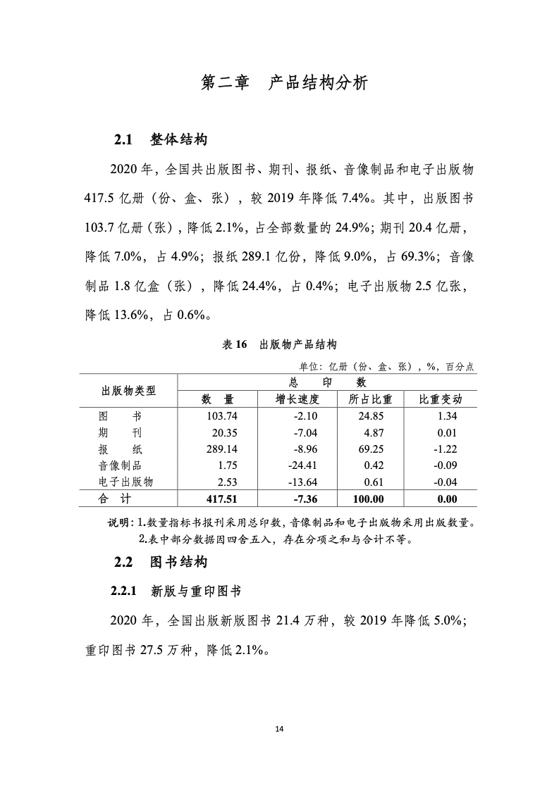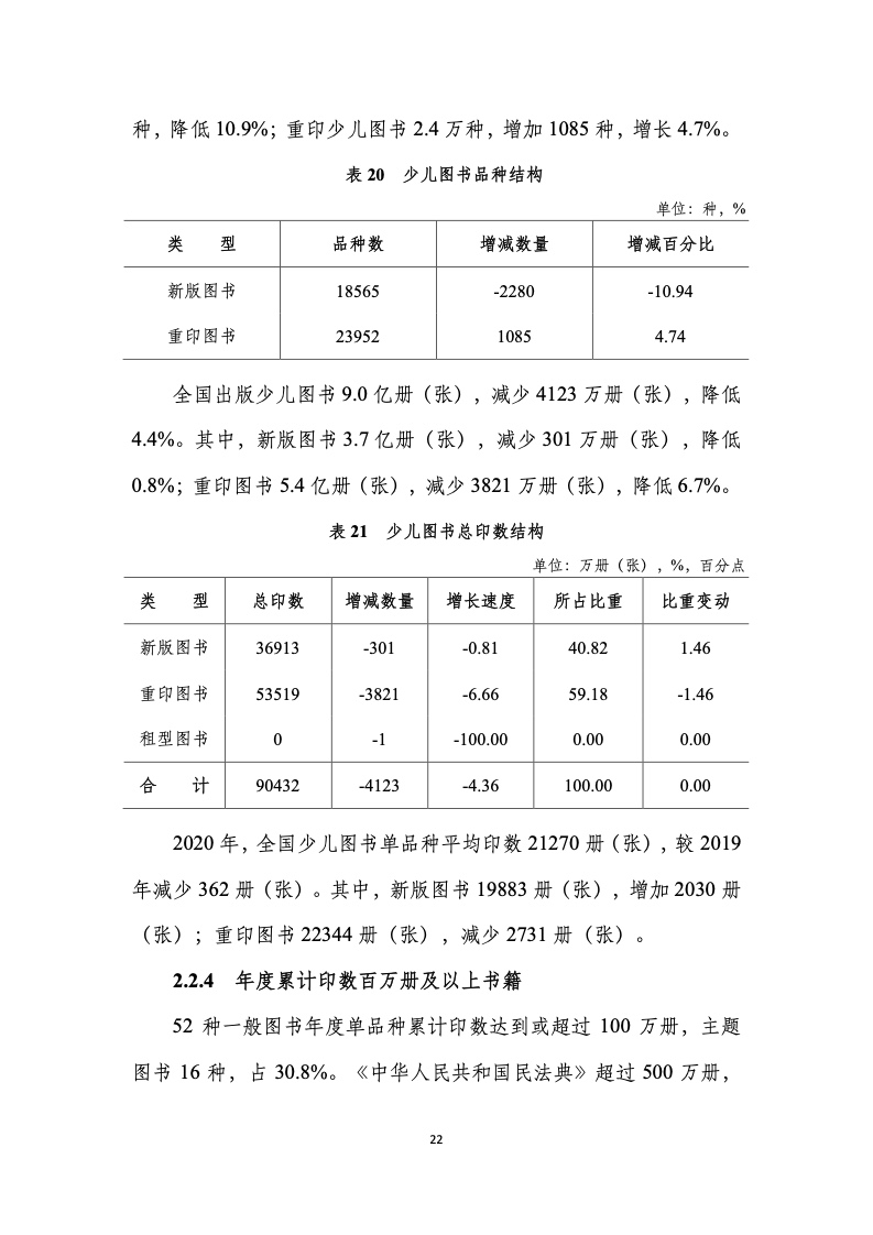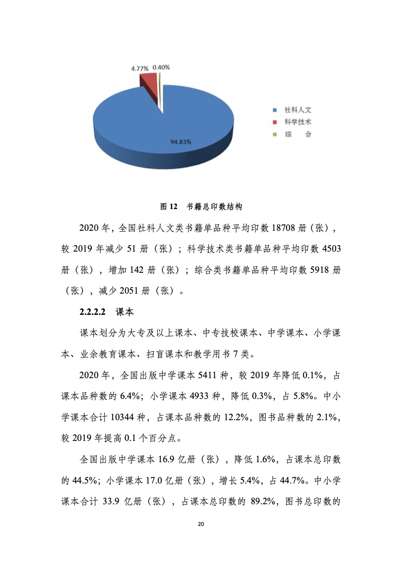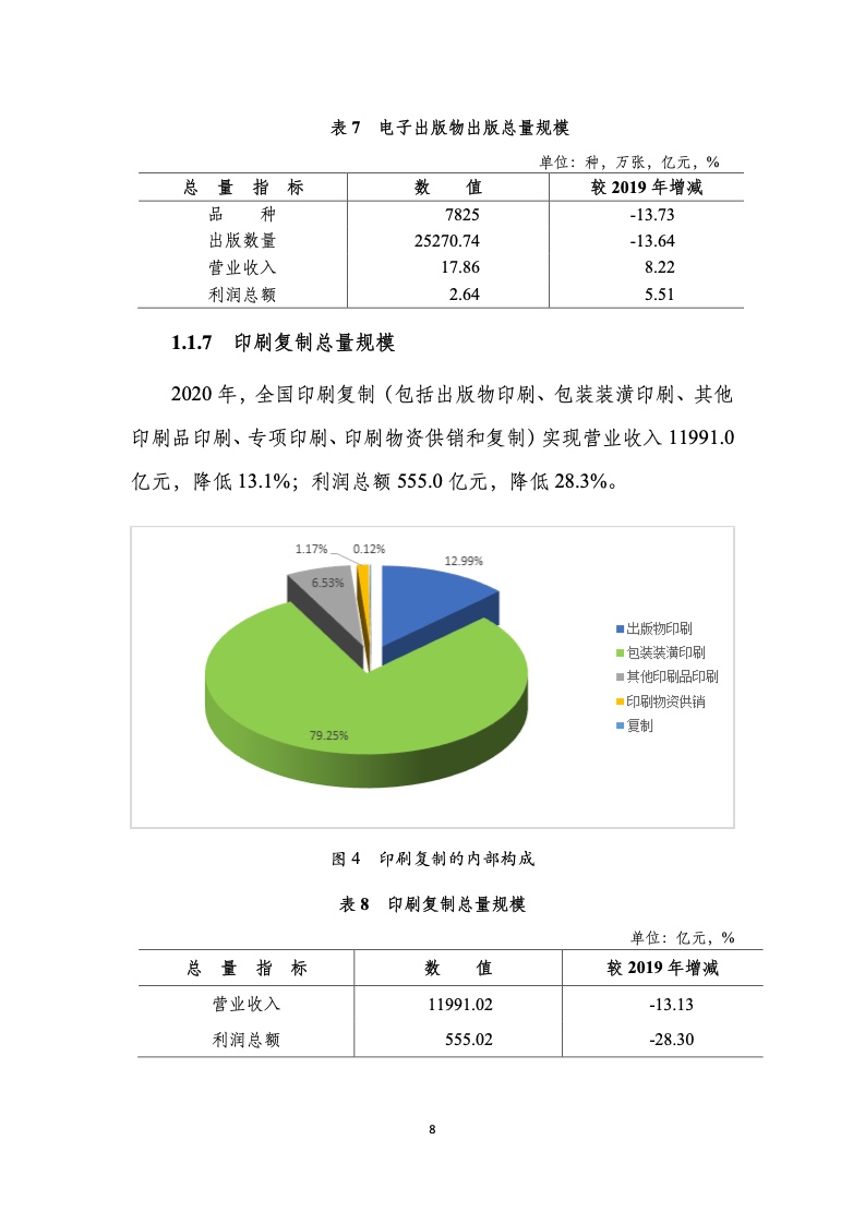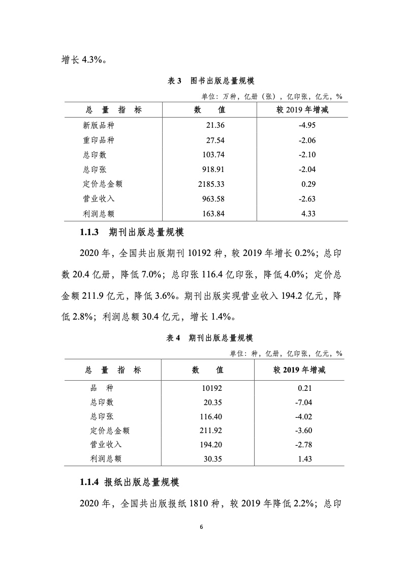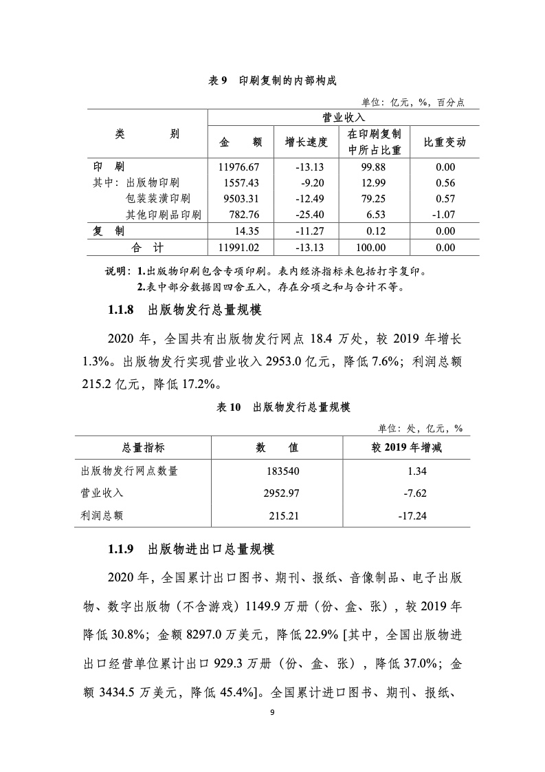 2020年全国图书品种新版较2019年降低5.0%,重印降低2.1%;全国图书总印数降低2.1%;图书出版实现营业收入963.6亿元,降低2.6%。52种一般图书达到或超过100万册,减少30种。报刊出版总印数分别降低9.0%和7.0%,实现营业收入分别降低6.4%和2.8%,降幅较上一年均有所加大。印刷复制实现营业收入降低13.1%,出版物发行实现营业收入降低7.6%。
