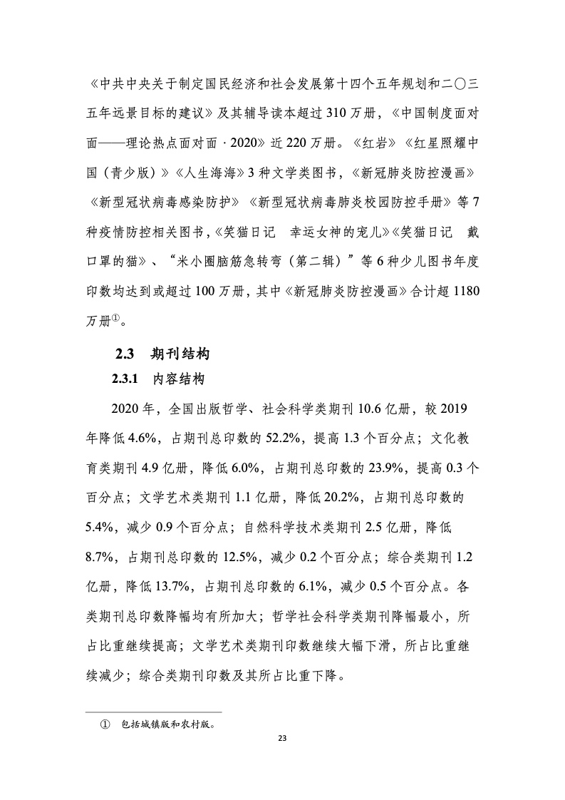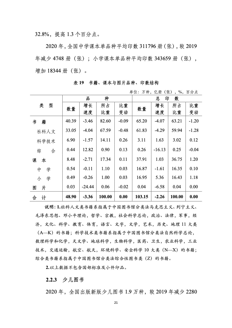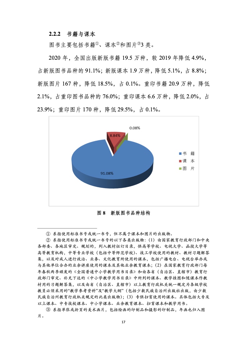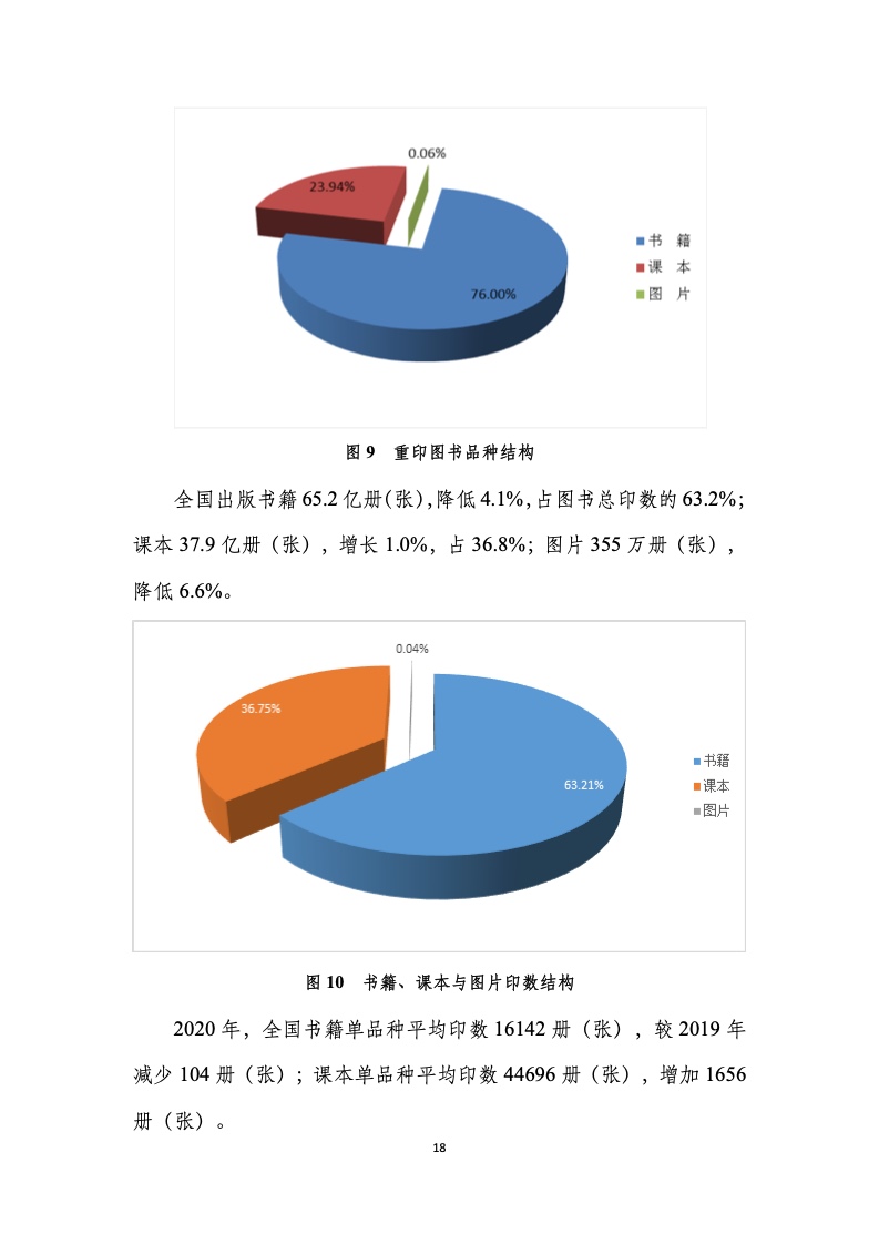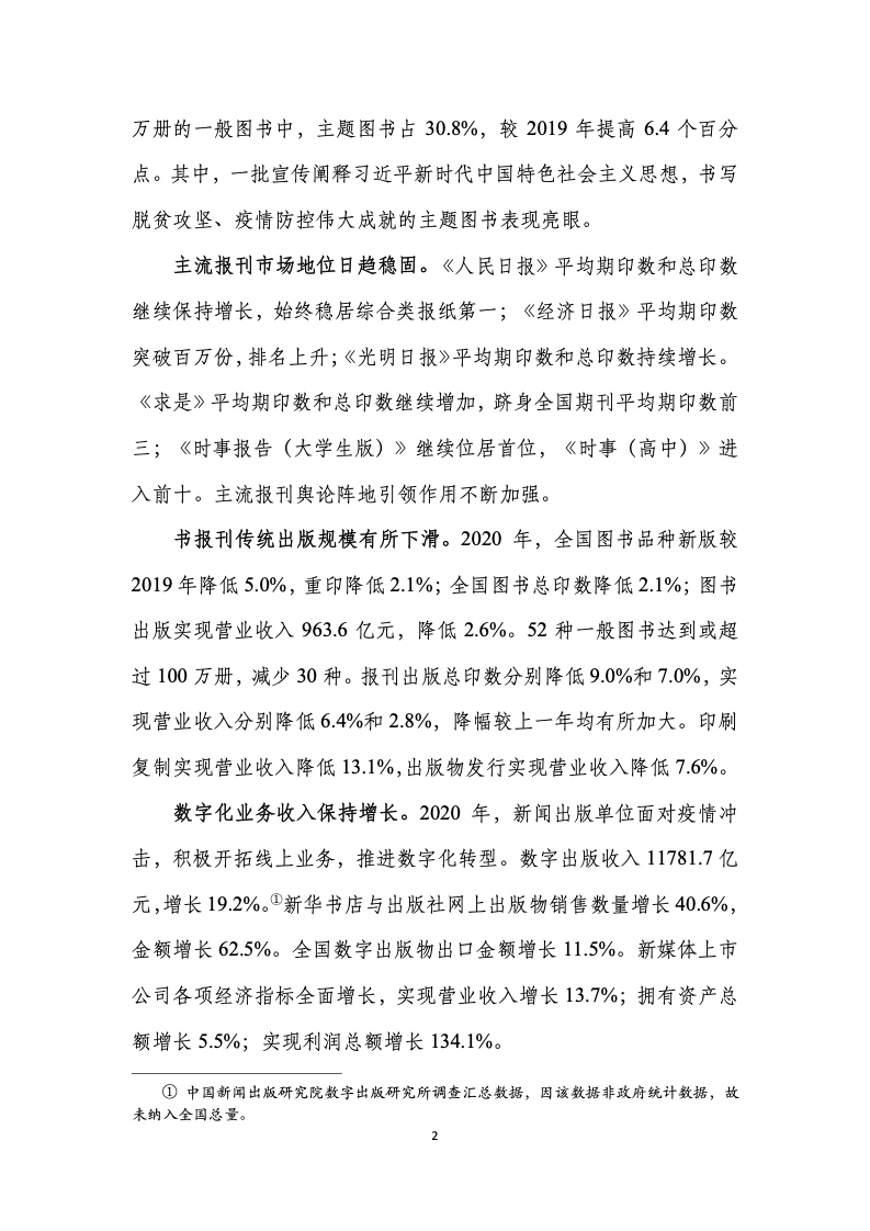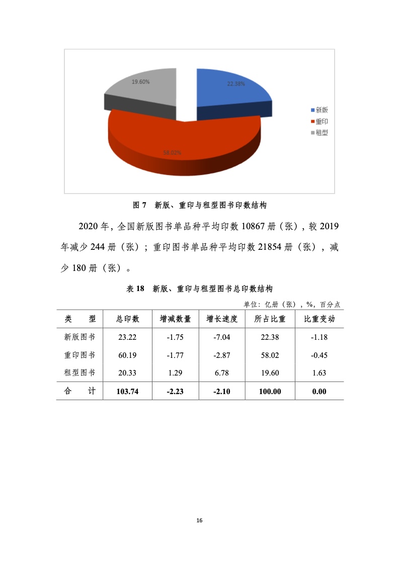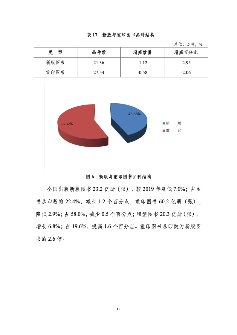 2020年全国图书品种新版较2019年降低5.0%,重印降低2.1%;全国图书总印数降低2.1%;图书出版实现营业收入963.6亿元,降低2.6%。52种一般图书达到或超过100万册,减少30种。报刊出版总印数分别降低9.0%和7.0%,实现营业收入分别降低6.4%和2.8%,降幅较上一年均有所加大。印刷复制实现营业收入降低13.1%,出版物发行实现营业收入降低7.6%。
