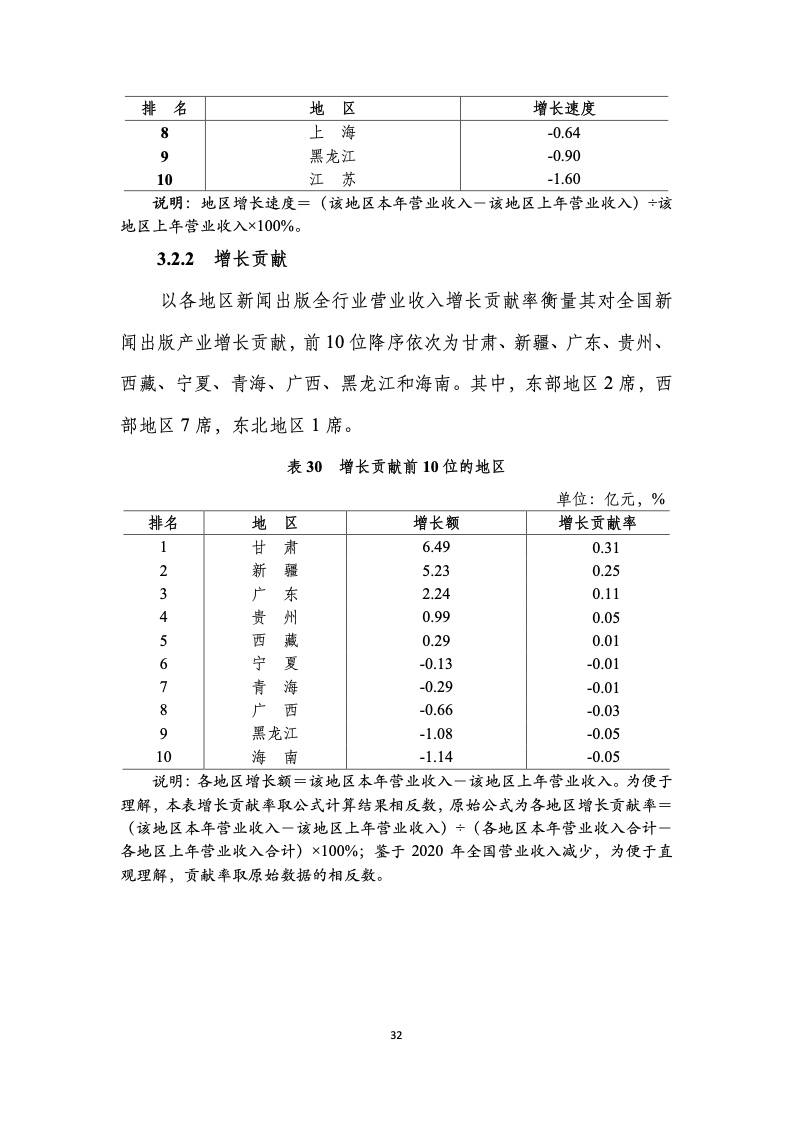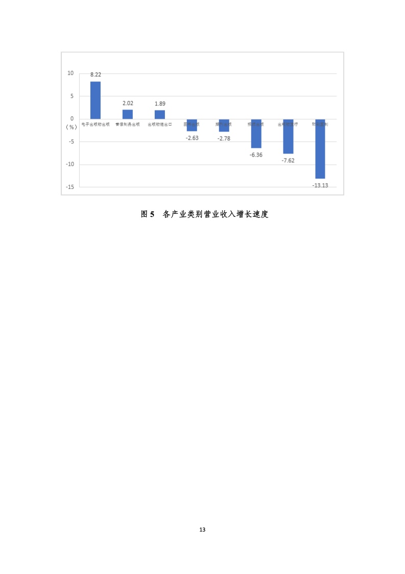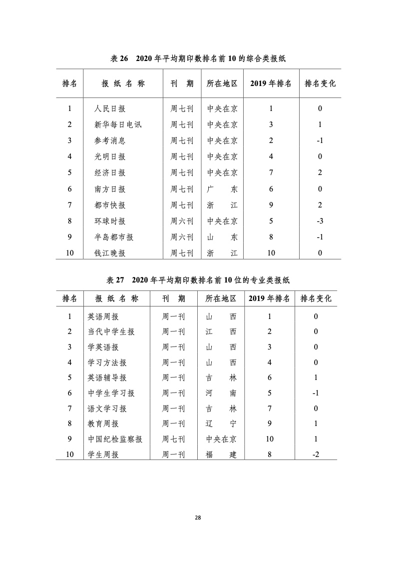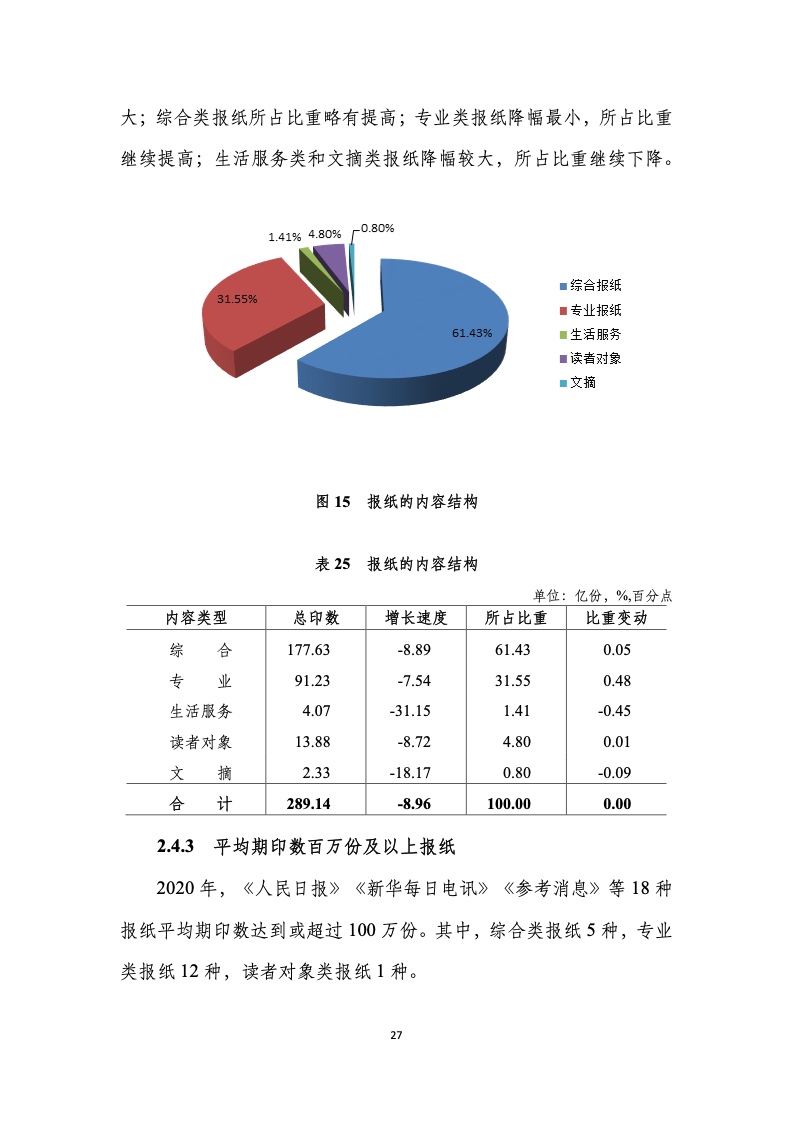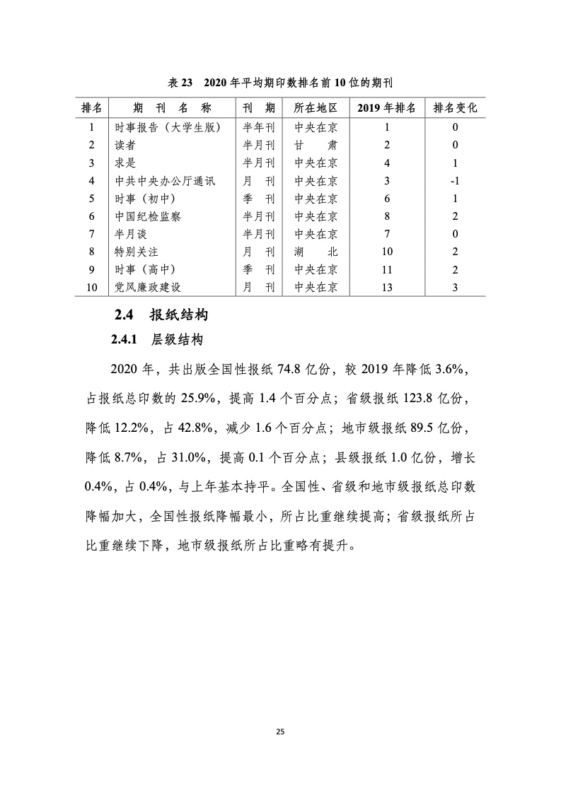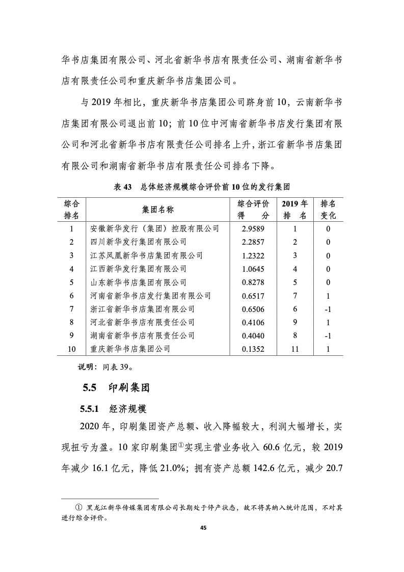 2020年全国图书品种新版较2019年降低5.0%,重印降低2.1%;全国图书总印数降低2.1%;图书出版实现营业收入963.6亿元,降低2.6%。52种一般图书达到或超过100万册,减少30种。报刊出版总印数分别降低9.0%和7.0%,实现营业收入分别降低6.4%和2.8%,降幅较上一年均有所加大。印刷复制实现营业收入降低13.1%,出版物发行实现营业收入降低7.6%。