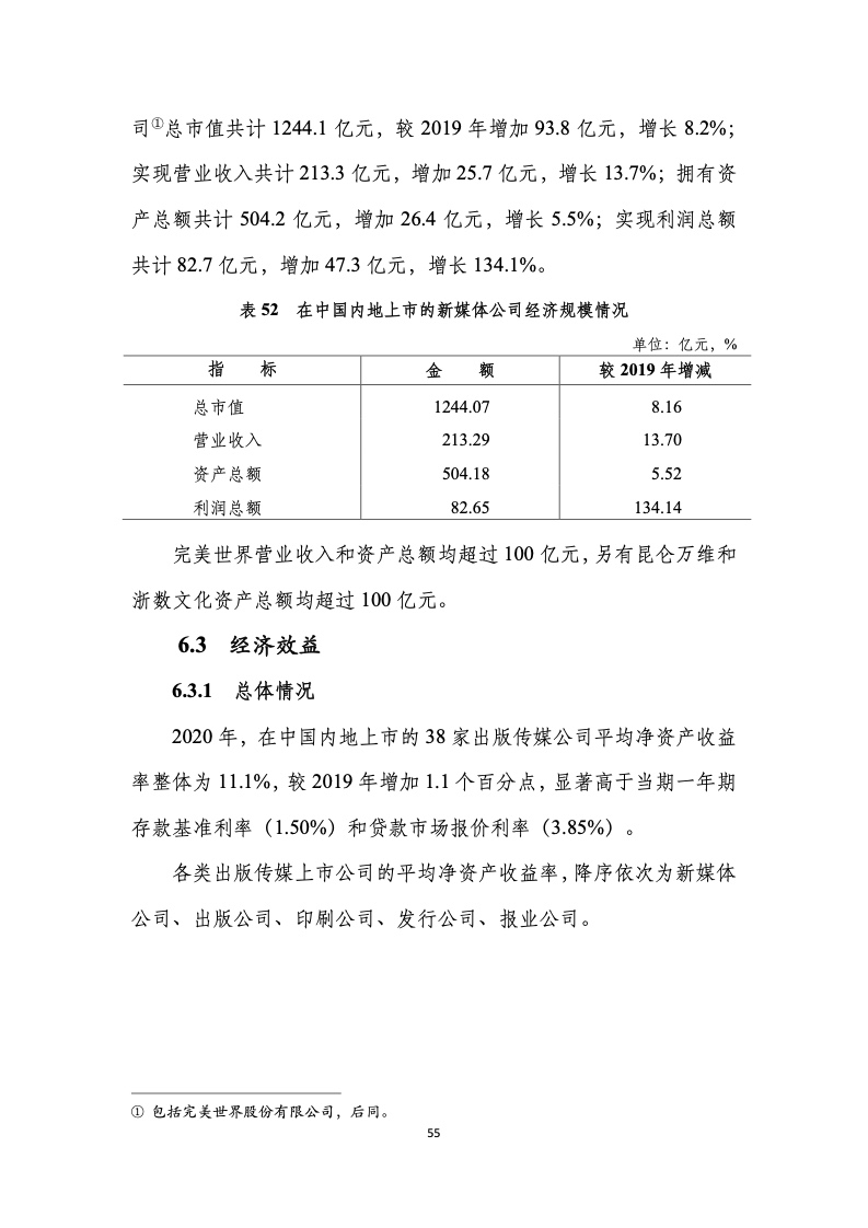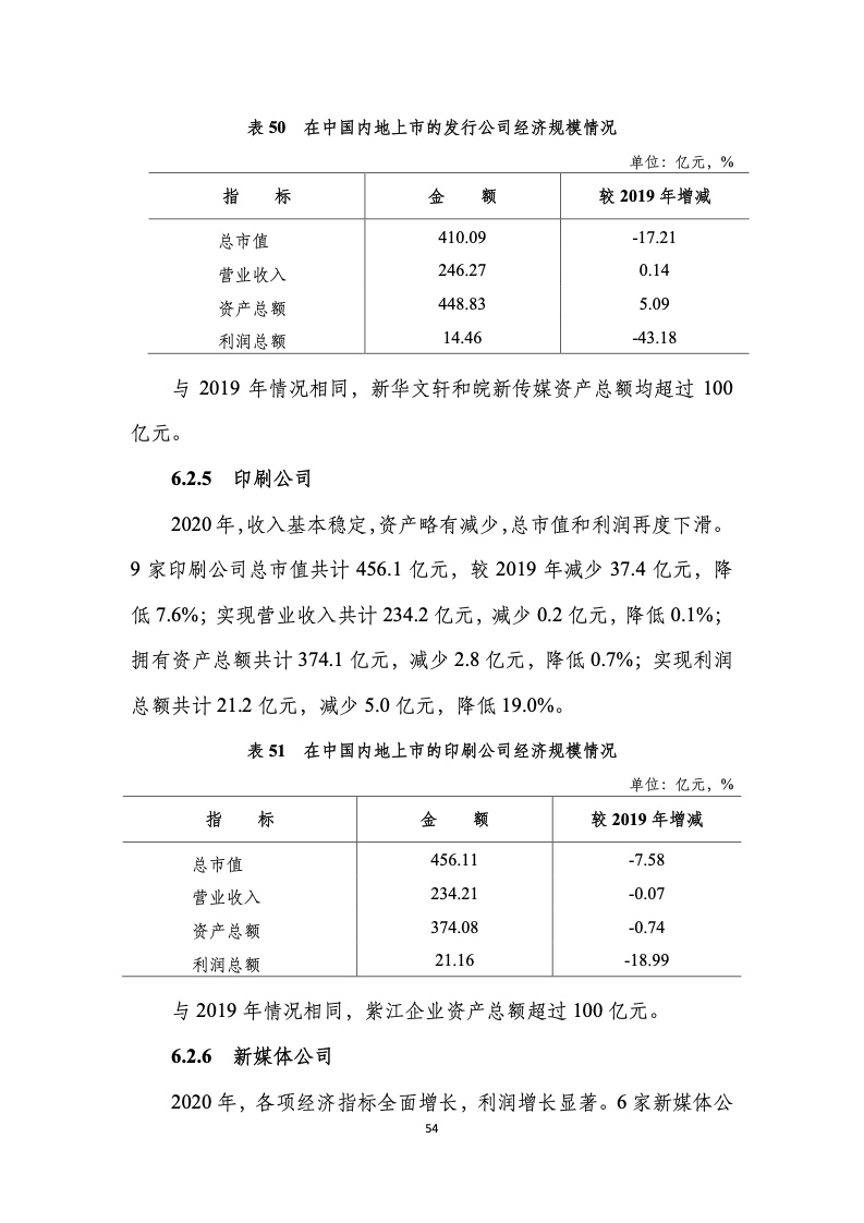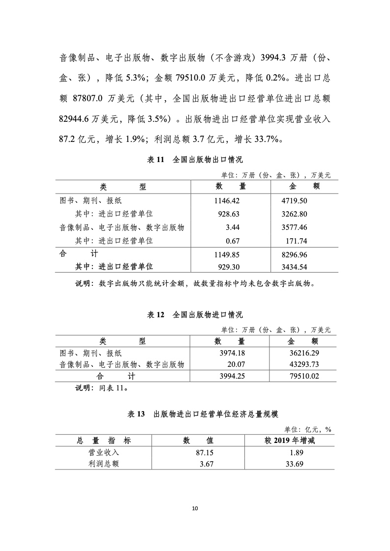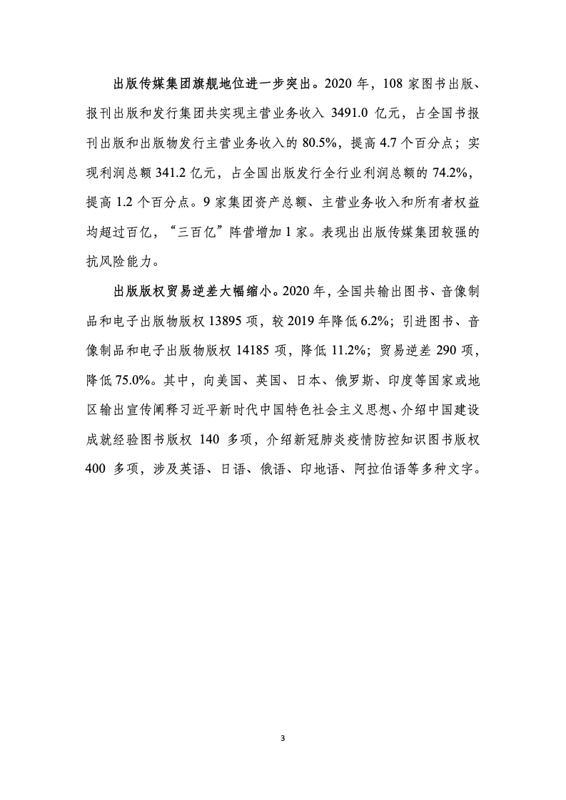 2020年新闻出版单位面对疫情冲击,积极开拓线上业务,推进数字化转型。数字出版收入11781.7亿元,增长19.2%。新华书店与出版社网上出版物销售数量增长40.6%,金额增长62.5%。全国数字出版物出口金额增长11.5%。新媒体上市公司各项经济指标全面增长,实现营业收入增长13.7%;拥有资产总额增长5.5%;实现利润总额增长134.1%。