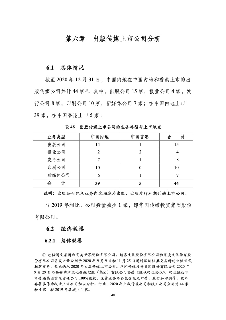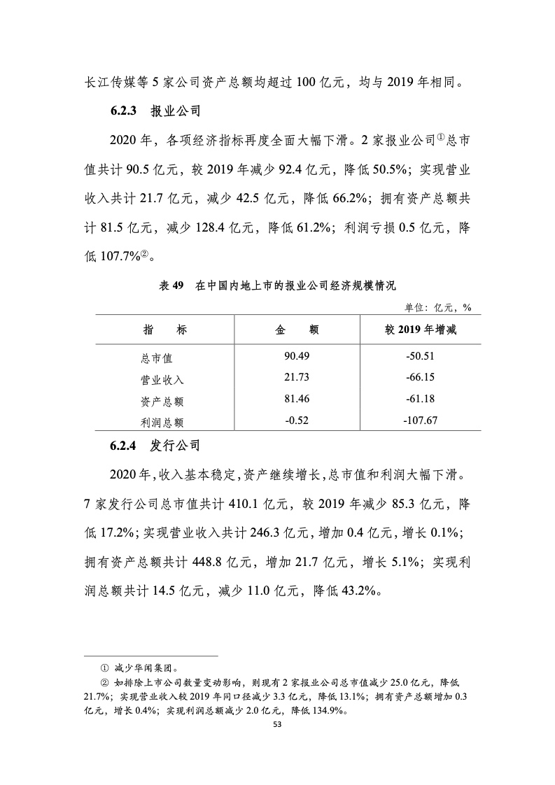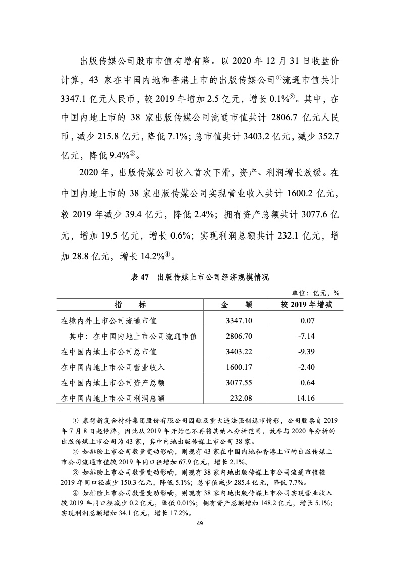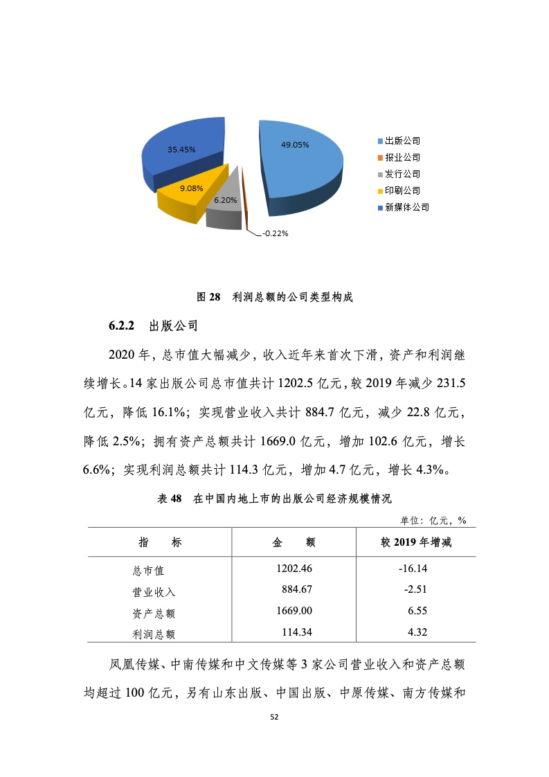 2020年新闻出版单位面对疫情冲击,积极开拓线上业务,推进数字化转型。数字出版收入11781.7亿元,增长19.2%。新华书店与出版社网上出版物销售数量增长40.6%,金额增长62.5%。全国数字出版物出口金额增长11.5%。新媒体上市公司各项经济指标全面增长,实现营业收入增长13.7%;拥有资产总额增长5.5%;实现利润总额增长134.1%。