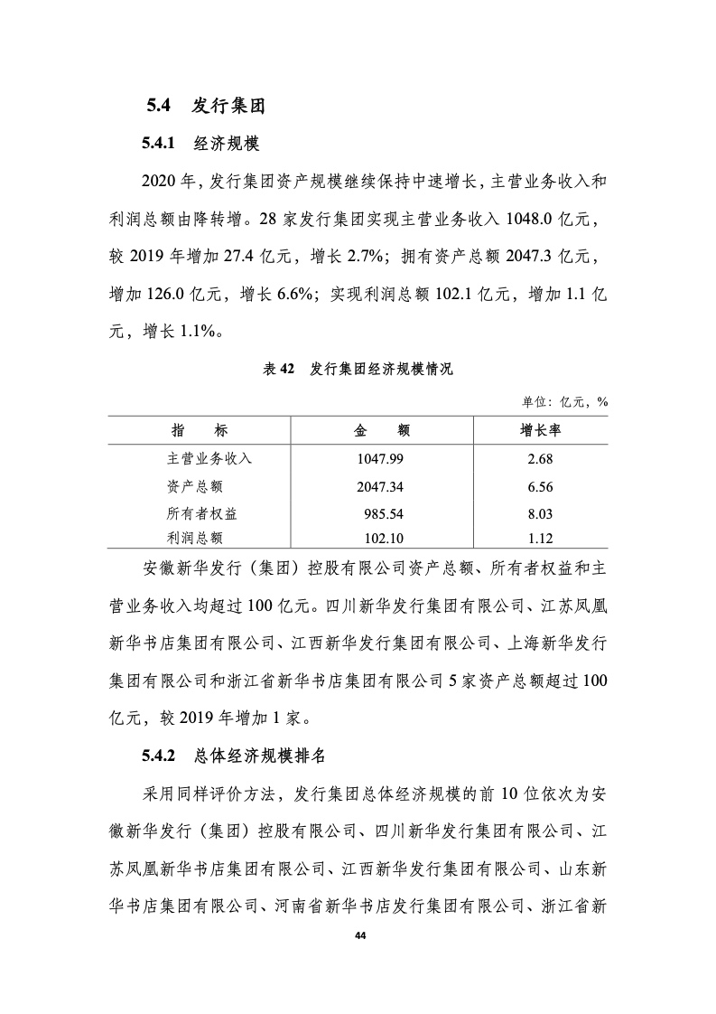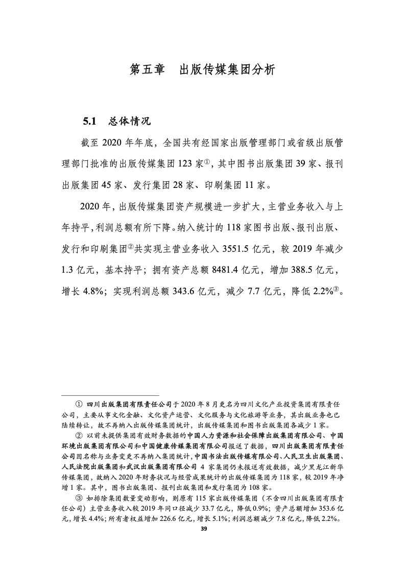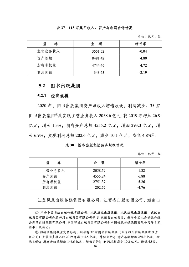2020年108家图书出版、报刊出版和发行集团共实现主营业务收入3491.0亿元,占全国书报刊出版和出版物发行主营业务收入的80.5%,提高4.7个百分点;实现利润总额341.2亿元,占全国出版发行全行业利润总额的74.2%,提高1.2个百分点。9家集团资产总额、主营业务收入和所有者权益均超过百亿,“三百亿”阵营增加1家。表现出出版传媒集团较强的抗风险能力。