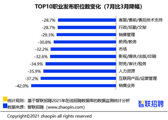 岗位结构方面,重点观察 7 月发布职位数前十的核心岗位,销售、产品运营、人力、财务等岗位较 3 月的收缩幅度较大,降幅分别为 42%、37.2%、35.9%、34.9%。整体业务的收缩首先会冲击销售、人力等通用性人才,此次政策重点规范的线上教育板块则对产品运营人才需求有一定影响。