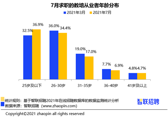 从年龄和从业经验结构看,教培从业者的整体年龄结构偏年轻,36.9% 为 25 岁及以下的 95 后群体,30 岁以下群体占到 7 成多;27.2% 的求职者仅从业不到一年,35.3% 从业 1-3 年。与政策出台前的 3 月对比,7 月份涌入求职市场教培从业者中,25 岁及以下的年轻人占比进一步提升 4.5 个百分点,从业经验在一年以内的求职者比例提高 3 个百分点。