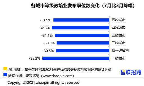 教培行业 7 月发布职位数比政策发布前的 3 月下降 32.4%(2019 年的这一数值仅为 1.9%),分城市等级看,一线城市降幅最大。一线城市人均可支配收入高且教育消费意愿强,因此一直都是教培行业的重点布局之地,也是大量教培机构集中之地。面临 “双减” 的落地,一线城市也首当其冲,最先受到波及,北京、上海更是成为全国第一批试点城市。智联招聘平台大数据显示,2021 年 7 月一线城市教培业发布职位数比 3 月减少了 38.2%,高于其他城市等级,其中北京降幅达 49.3%,居全国首位。