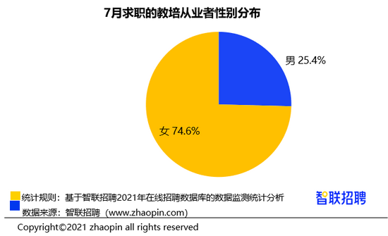 从性别来看,女性求职者的数量明显多于男性,比例分别为 74.6% 和 25.4%,这与教培行业属性相关,教师群体的女性比例一贯较高。