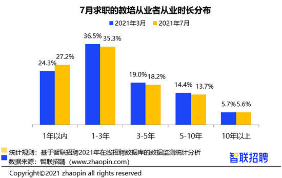 2021 年 7 月进行求职的原教培从业者中,51.4% 已为离职状态,这一比例高于全平台活跃求职者的平均水平(44.7%)。教培从业者本身流动性较强,加之近期业内机构进行业务调整,人员变动大,加剧了整体流动性。