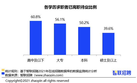 学历越低,待业比例越高,高中以下学历求职者中 6 成待业