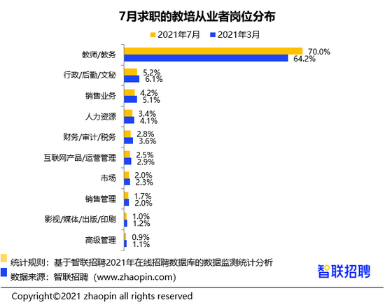 教师 / 教务为求职主体,比例达 7 成,较政策前提高 6 个百分点