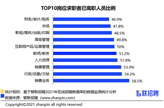 再进一步观察求职人数前十的岗位中,销售业务的已离职比例最高,接近 6 成已处于离职状态,教师 / 教务人群的离职比例为 51.2%,另有 18% 的人处于在职看机会状态。
