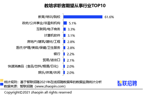 智联招聘平台数据显示,7 月求职者中,61.6% 的求职者依然期望能够从事教培行业,其次,政府 / 公共事业 / 非盈利机构(5.1%)、互联网 / 电子商务(3.3%)、计算机软件(3.1%)、房地产(2.8%)等也是部分人的转行选择。