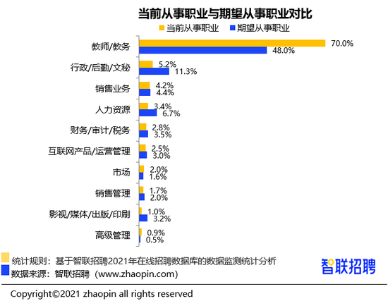 对比求职者当前从事岗位与期望从事岗位比例,发现期望从事教师 / 教务岗位的人数比例明显降低,而期望从事行政、人力岗位的比例扩张。7 月求职的教培从业者中,70% 原来从事教师 / 教务岗位,但期望从事这一岗位的比例为 48%,下降 22 个百分点。期望从事行政和人力资源岗位的人群则比当前从事这两个职业的比例分别提高 6 个和 3.3 个百分点。