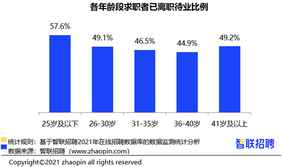 观察各年龄段求职者的离职待业比例,发现 25 岁以下群体的离职比例最高,达 57.6%;同时,41 岁及以上的高龄群体待业比例也较高,为 49.2%。