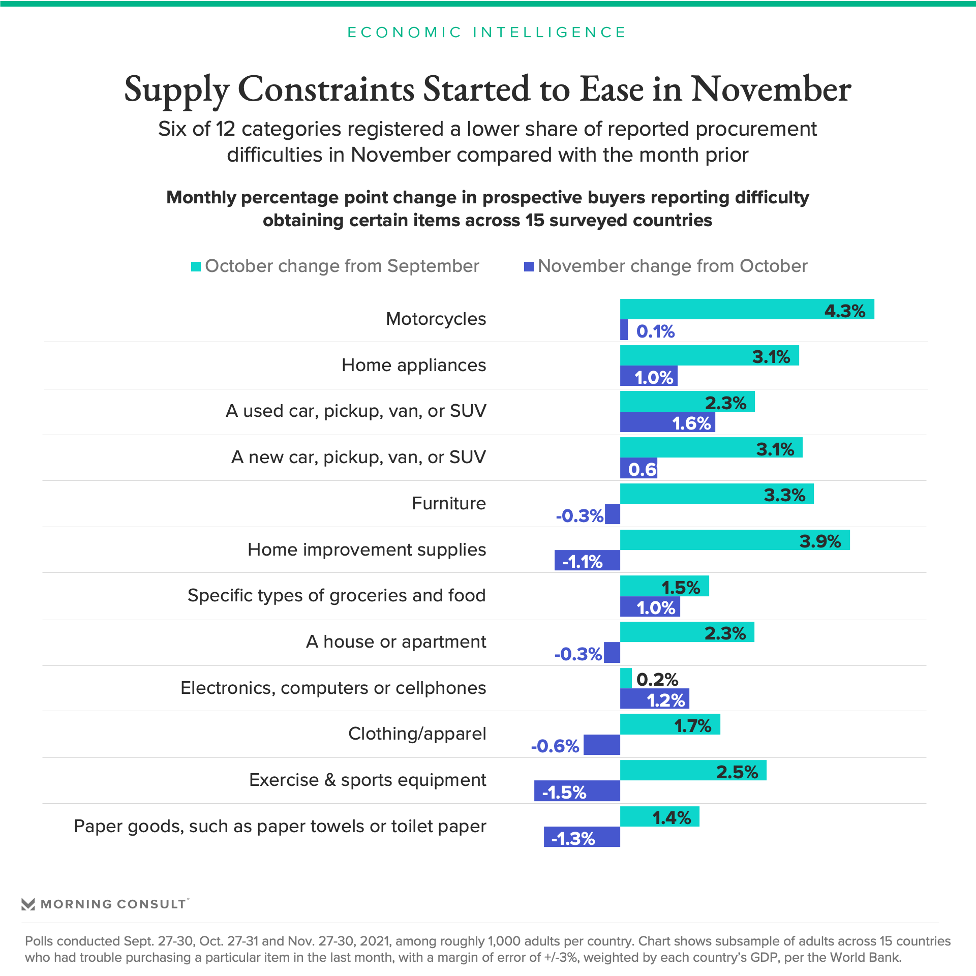 进入2021年最后一个月,供应链动态似乎朝着积极的方向发展。上个月受短缺影响的几个类别表现出温和的改善;10月-11月期间,在所有15个国家的12个类别中有6个类别的潜在买家报告购买困难。