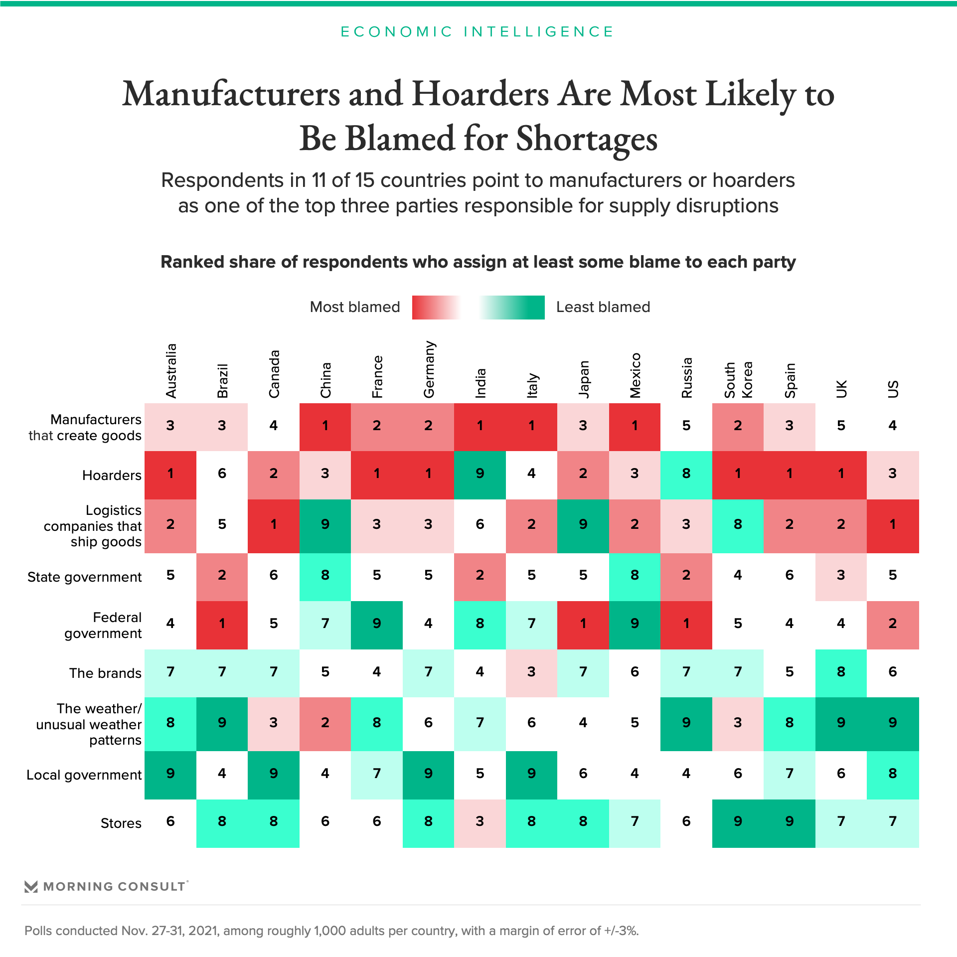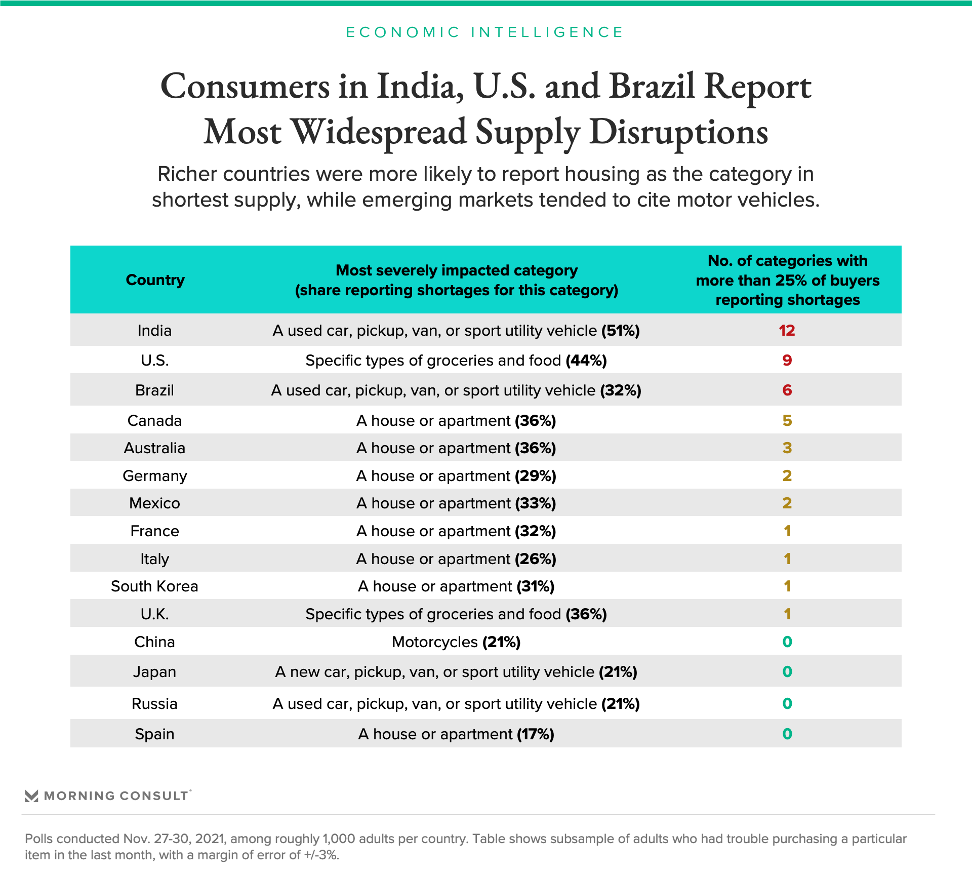 在接受调查的15个国家中有11个至少有一个产品类别的潜在买家在11月份报告了购买困难。印度、美国和巴西的供应中断最为普遍,有6种或6种以上产品严重短缺。
