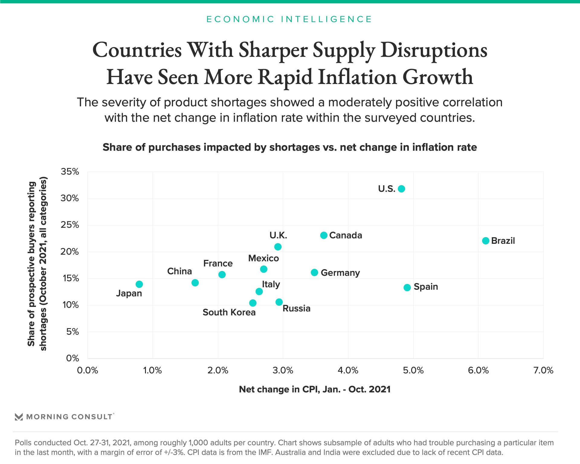 在接受调查的国家中,更严重的供应链中断往往与今年的通胀上升有关。报告产品短缺的消费者比例与该国1月-10月通胀率的净变化呈中度正相关。