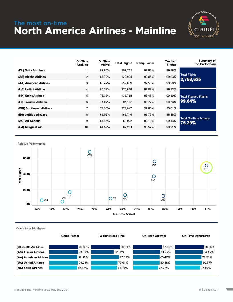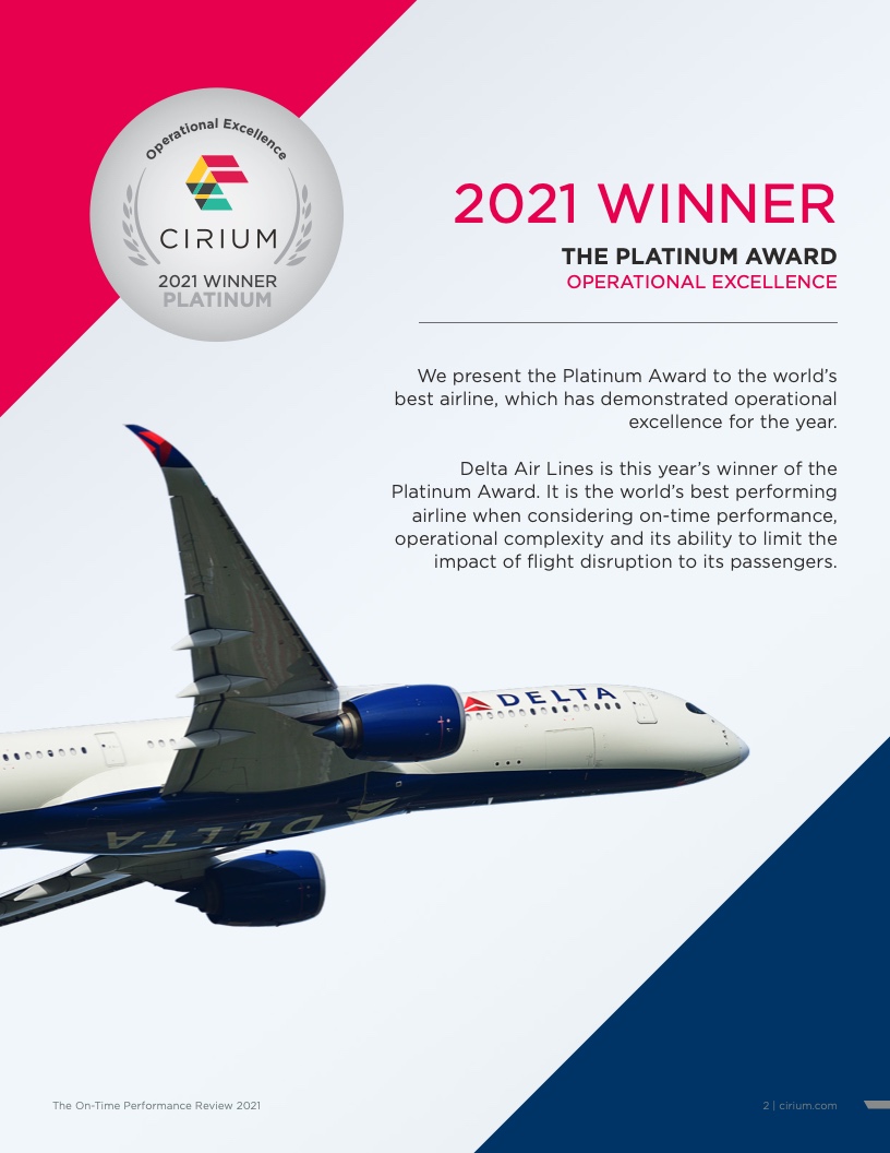 航空分析公司Cirium(睿思誉)发布了《2021准点率报告》,这是对航空公司运营表现进行评比的全球标准。Cirium(睿思誉)授予总部位于亚特兰大的达美航空白金奖,表彰其为全球年度表现最佳的航空公司。