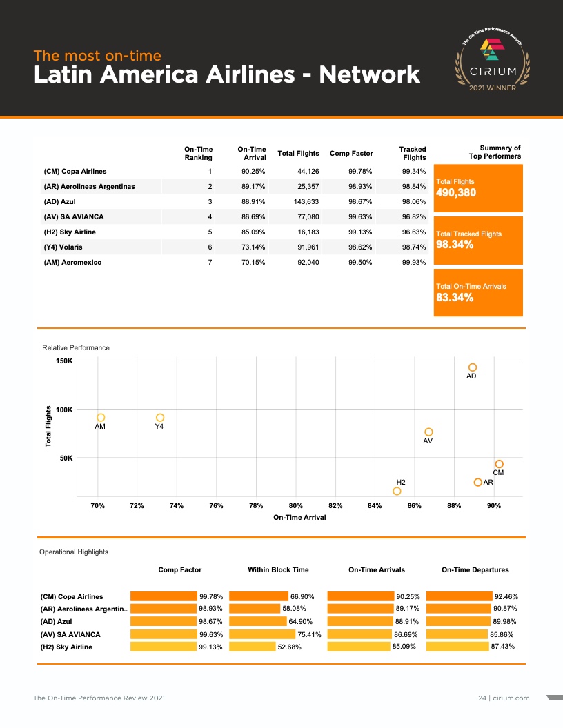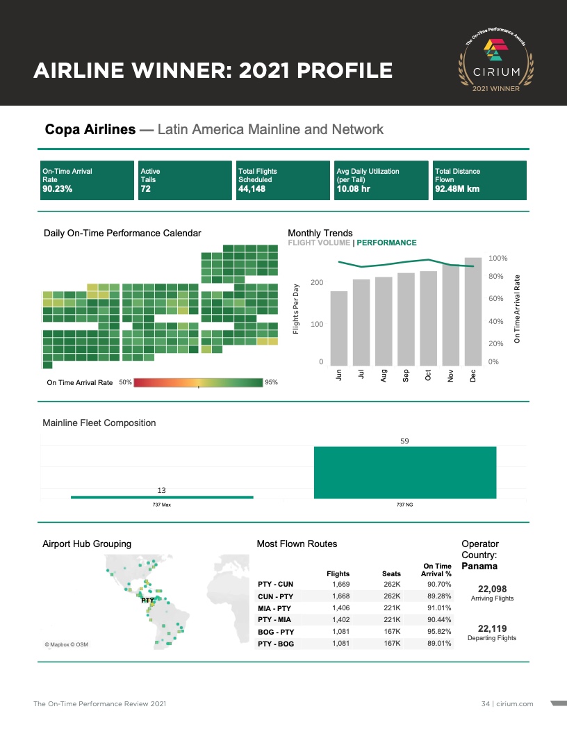 巴拿马航空公司(Copa airlines)在新冠肺炎疫情开始全球蔓延时接近完全关闭,目前正在强劲复苏,并以非常高的准点率运营其不断扩大的航班时刻表。该航空公司以90.3%的航班准点率赢得了拉丁美洲区域的冠军,其次是准点率分别为89.2%和88.9%的阿根廷航空航空公司和巴西阿苏尔航空公司。