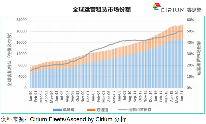 2021年的情况对许多商业航空市场部门提出了挑战,尤其是经营性租赁,即在不转让所有权的情况下将飞机租赁给航空公司运营商的做法。在上一个增长周期中,经营性租赁继续为航空公司运营商提供了近50%的全球单通道和双通道客运机队。2019年底,在全球大约2.2万架由航空公司运营或存放的客机中,刚好48%是由租赁商管理。大约22个月后,即2021年10月底,全球在役和存放的客机数量仅增长了约300架,租赁渗透率增长了2.2%,因此租赁商的自有飞机组合增加了660多架。租赁部门终于实现了神话般的“50%市场份额”。这主要是因为自2020年初以来,租赁商为将近65%的新飞机交付提供融资(包括他们自身的订单以及售后回租(PLB),以及通过售后回租大量进一步购入(通常是接近全新的)二手飞机。由于飞机进入资产组合,租赁商退役的飞机数量比平时少,同期仅有250多架飞机拆解,约占所有退役飞机数的37%。