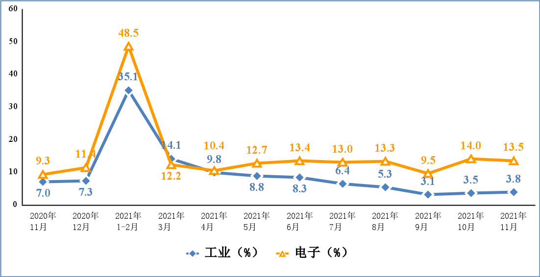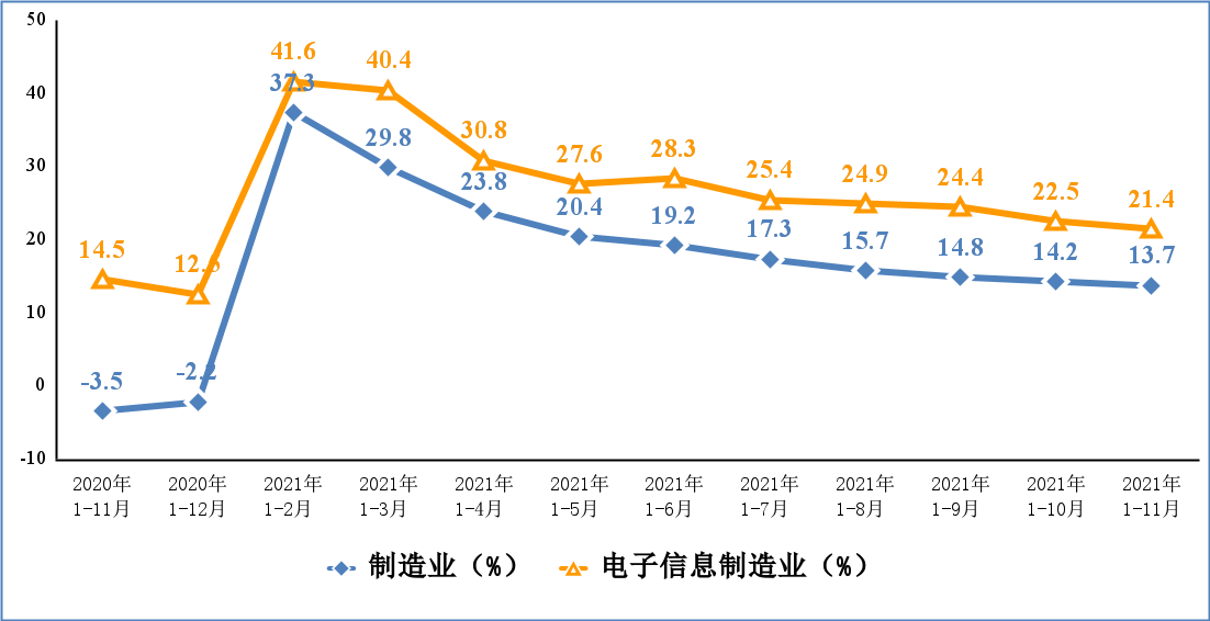 11 月份,规模以上电子信息制造业增加值同比增长 13.5%,增速比上年同期提高 4.2 个百分点,比同期规模以上工业增加值增速高 9.7 个百分点,但较高技术制造业增加值增速低 1.6 个百分点。1—11 月份,规模以上电子信息制造业增加值同比增长 16.2%,增速比上年同期提高 9.0 个百分点。
