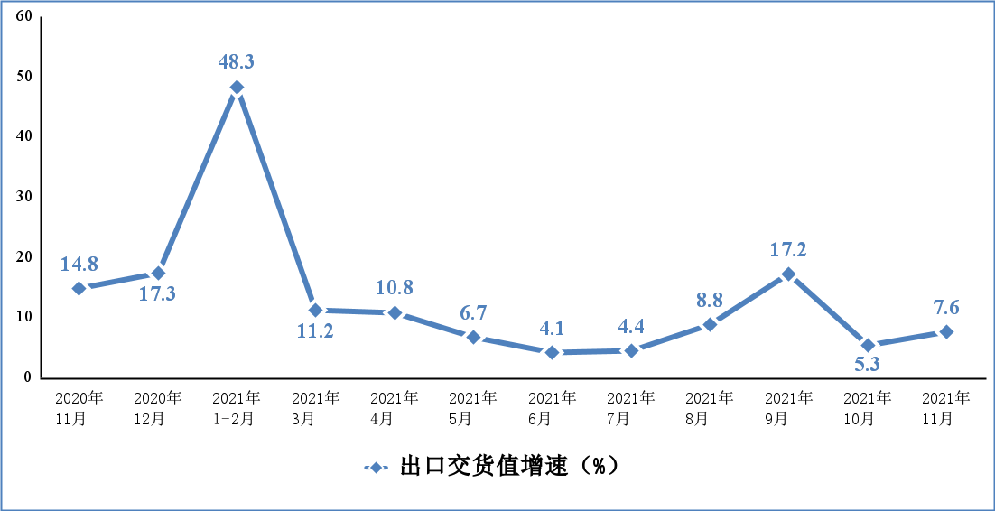 11 月份,规模以上电子信息制造业实现出口交货值同比增长 7.6%,增速比上月回升 2.3 个百分点,比同期规模以上工业出口交货值增速低 5 个百分点。1—11 月份,规模以上电子信息制造业累计实现出口交货值同比增长 12.6%,增速比上年同期提高 7.2 个百分点。