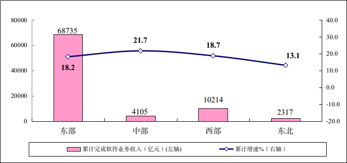 东部地区软件业收入增速回落,中部地区增势突出。1-11 月份,东部地区完成软件业务收入 68735 亿元,同比增长 18.2%,比 1-10 月份回落 1.2 个百分点;中部地区完成软件业务收入 4105 亿元,同比增长 21.7%,比 1-10 月份提高 0.3 个百分点,高出全国平均水平 3.4 个百分点;西部地区完成软件业务收入 10214 亿元,同比增长 18.7%,比 1-10 月份提高 0.3 个百分点,高出全国平均水平 0.4 个百分点;东北地区完成软件业务收入 2317 亿元,同比增长 13.1%,比 1-10 月份提高 1 个百分点。四个地区软件业务收入在全国总收入中的占比分别为 80.5%、4.8%、12.0% 和 2.7%。