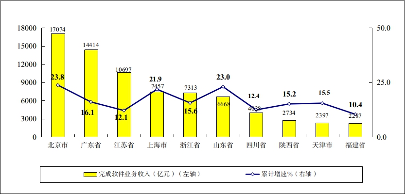 主要软件大省收入占比小幅提高。1-11 月份,软件业务收入居前 5 名的省份中,北京、广东、江苏、上海和浙江软件业务收入分别为 17074 亿元、14414 亿元、10697 亿元、7457 亿元和 7313 亿元,分别增长 23.8%、16.1%、12.1%、21.9% 和 15.6%,五省 (市) 合计软件业务收入 56955 亿元,占全国比重为 66.7%,占比较去年同期提高 0.8 个百分点。