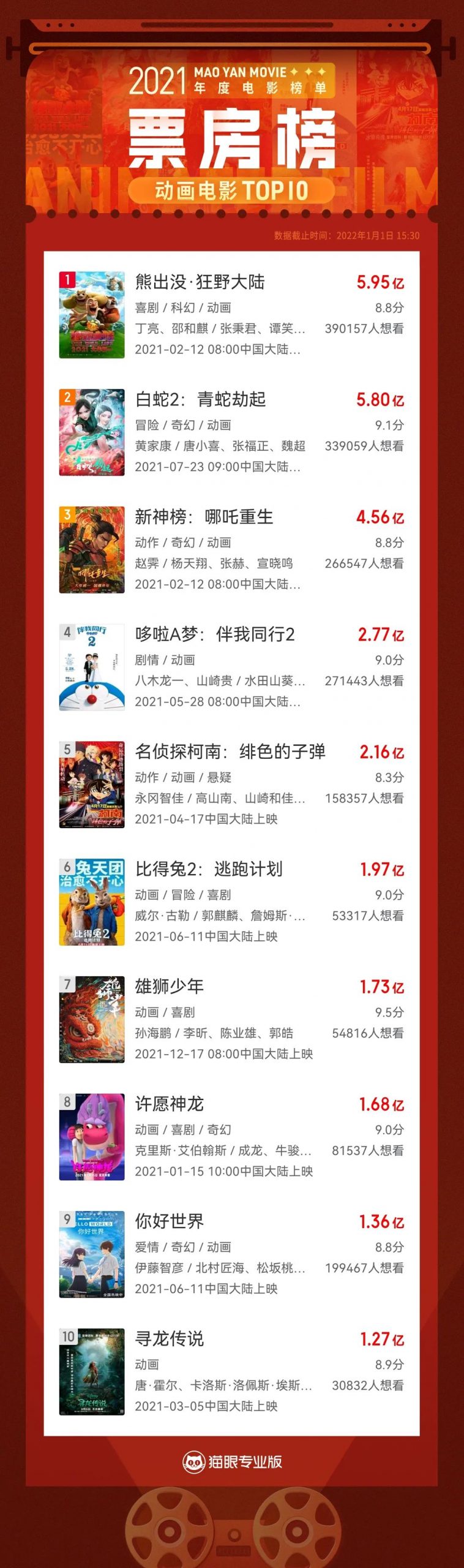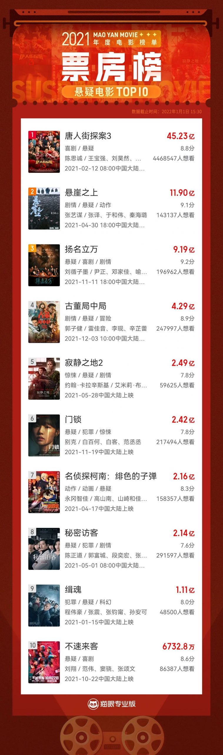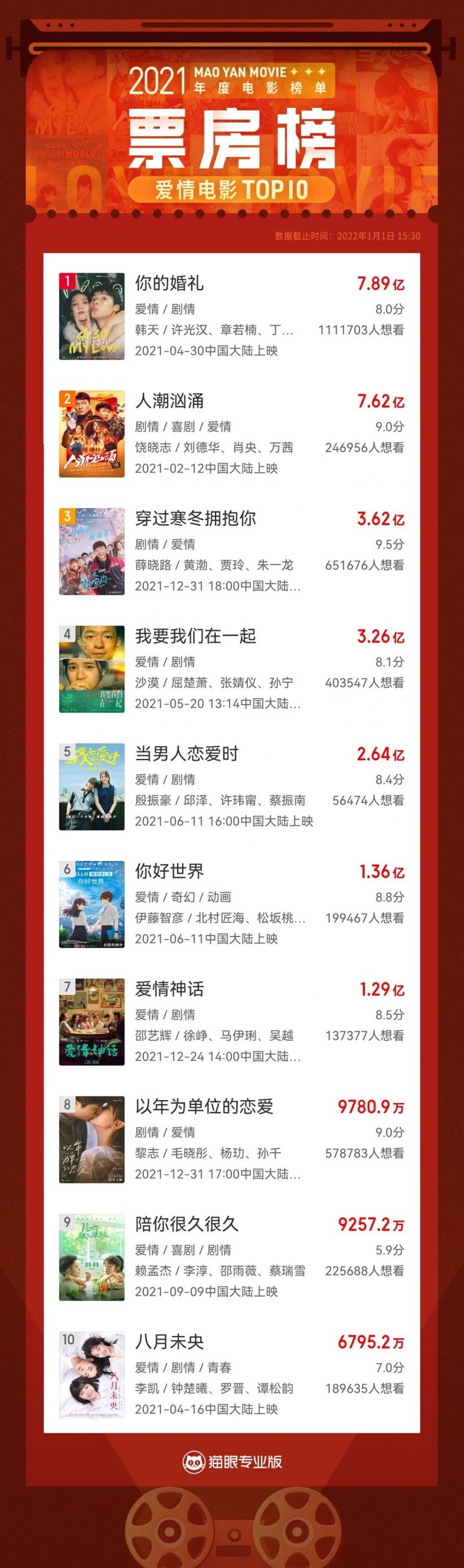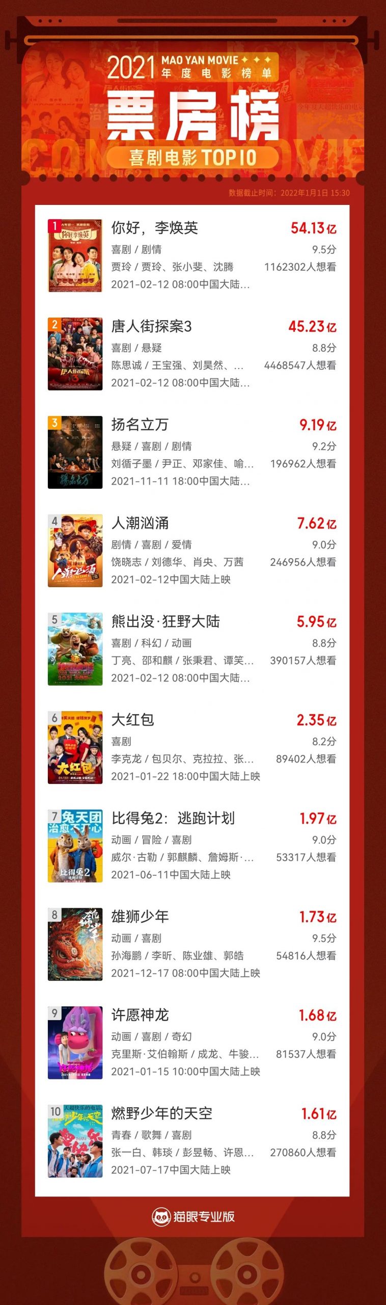 猫眼研究院:2021年度电影类型票房榜–喜剧电影Top10 更多阅读:猫眼研究院:春节档新片总票房(含点映)破亿!猫眼研究院:2023年度票房破250亿猫眼研究院:2021年度电影票房榜–TOP10国产电影占据8部猫眼研究院:2022国庆档总票房14.9亿猫眼研究院:2022年中秋节票房破1.4亿猫眼研究院:2023年五一档数据洞察猫眼研究院:2022年短剧热度榜猫眼研究院:2022国庆档数据洞察猫眼研究院:《阿凡达2》进入2022全球票房榜第10位猫眼研究院:2022年贺岁档票房破6亿猫眼研究院:2023端午档总票房8.92亿猫眼研究院:2022贺岁档总票房破10亿猫眼研究院:2023年5月猫眼「电视剧」热度榜猫眼研究院:2023年2月总票房破30亿猫眼研究院:2023年5月总票房破30亿