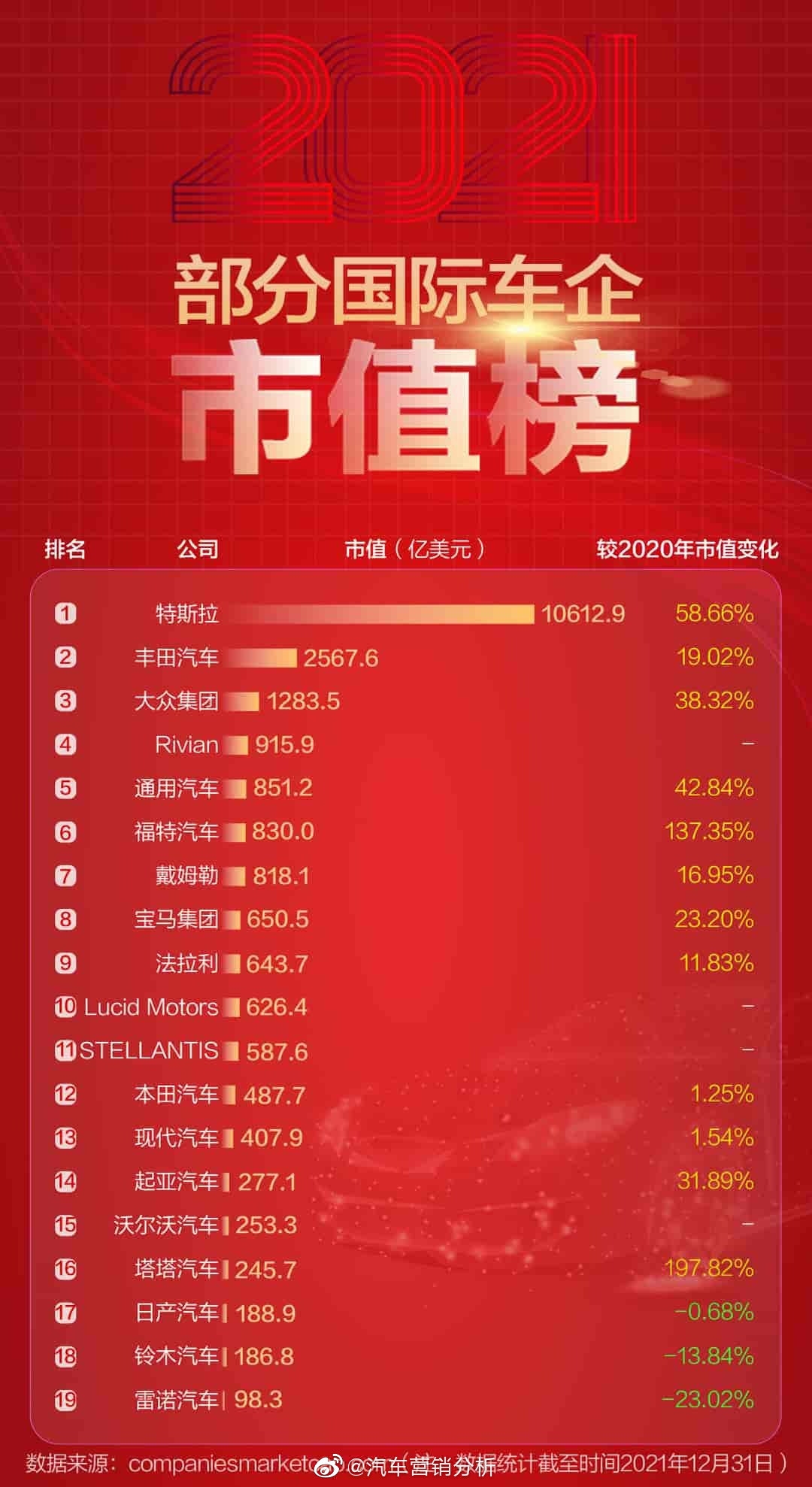 位于第二名的是丰田,市值达到了2567.6亿美元,相较于2020年增长了19.02%,虽成绩也很不错,但在特斯拉的光芒下,显得相当不够看。