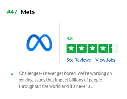GlaSSDoor表示, Facebook员工对公司给予他们工作自主权、提供广泛的福利、让他们有机会开发一款影响广泛的产品,并与他们喜欢的同事一起工作,给予了高度评价。
