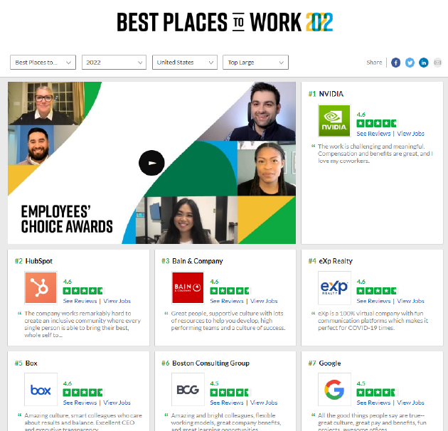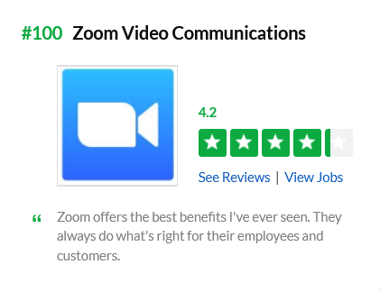 另一家排名显著下降的科技公司是视频会议软件巨头Zoom,去年排名第22位,但今年降至第100位,成为榜单上跌幅最大的公司。员工们赞赏该公司的福利、无限的带薪休假以及在增长时期对开发产品的热情,但也有一些人认为,在高业务需求和快节奏的工作环境下,Zoom企业文化发生了消极的转变。